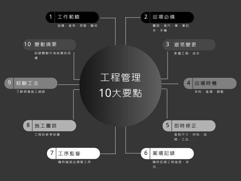 重點時刻必需到場,像是工班進場、材料送達、或需要調整設計的時候,盯緊這些關鍵環節。