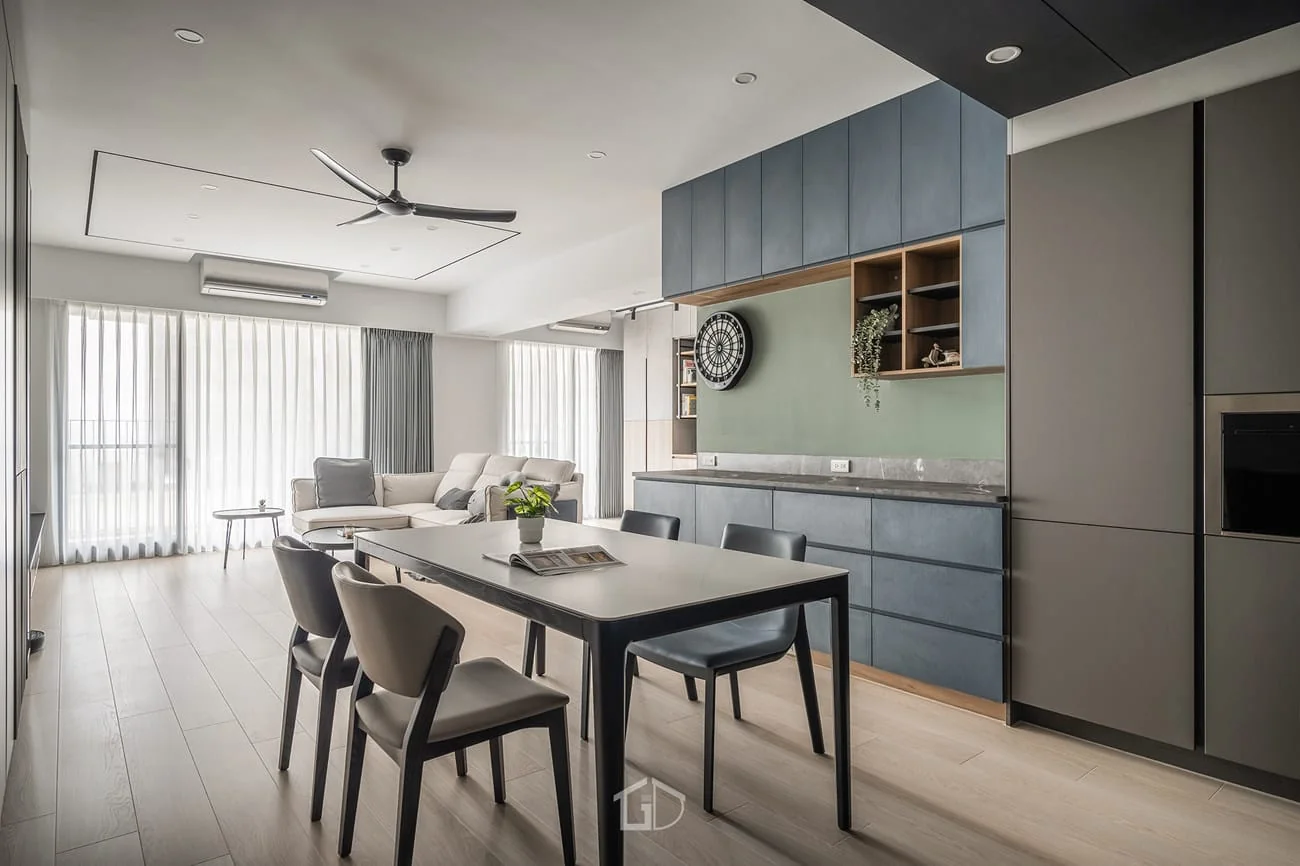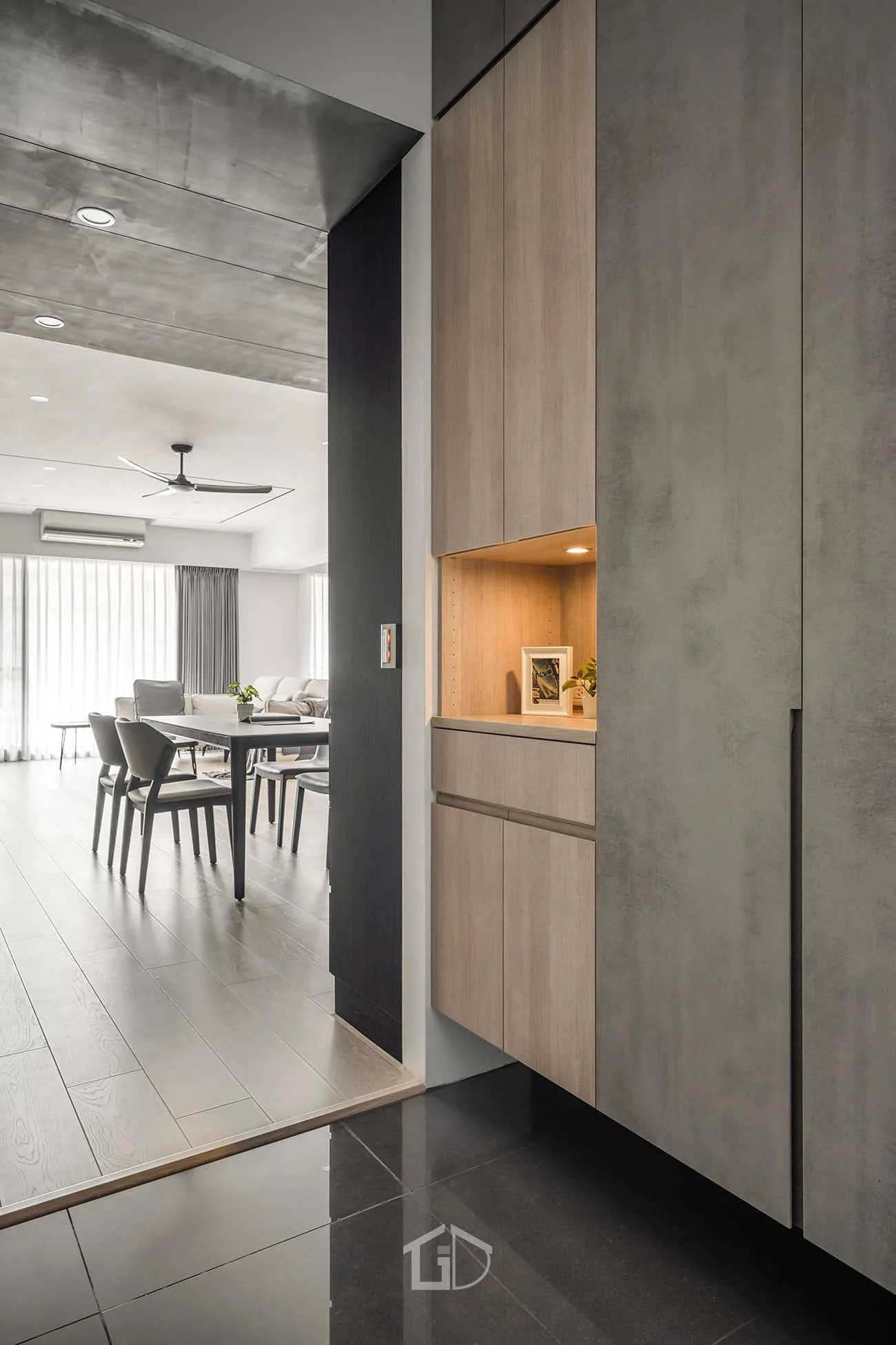 玄關處可見酪梨綠、質感木頭、沉穩深色