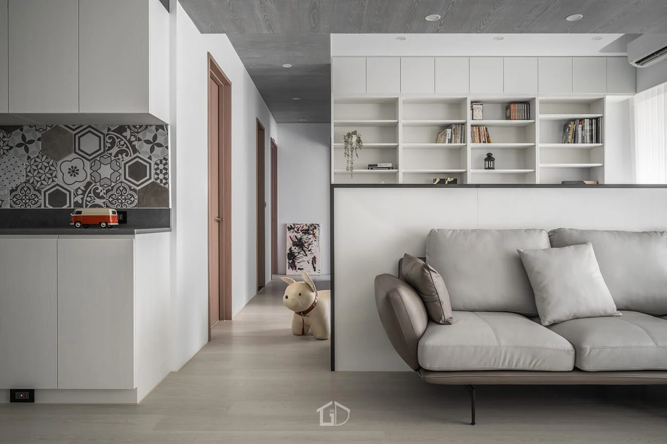 藉由櫃體上下方的留白、材質拼貼來減輕空間的負擔,隨著空間的化繁為簡,生活在其中,更顯自然而愜意。