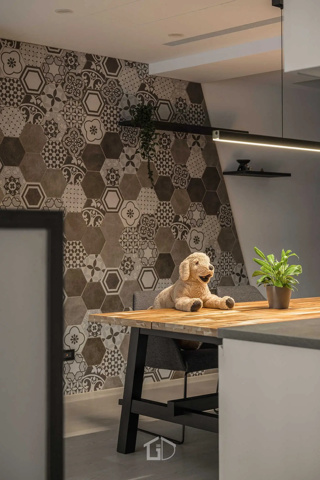 從玄關處具泥土元素感的花磚,結合牆面較為斜角度的花磚分割,再回到客廳的淺色系木地板,由深入淺的安排,不僅讓視