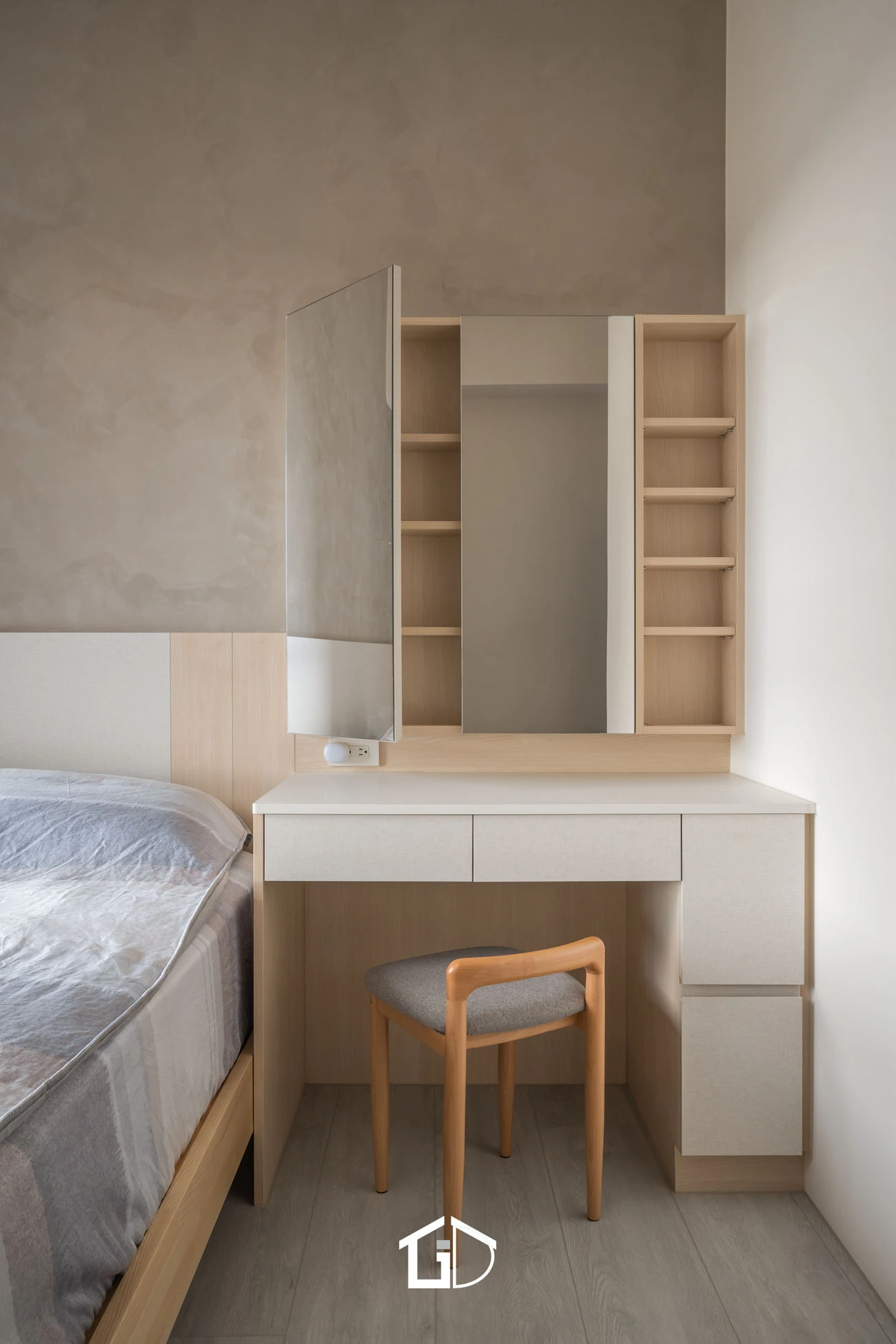 臥室承襲同樣的風格美學,暖白與奶茶色錯落交匯出舒眠的溫馨感,賦予木質家具全新的意義,讓其成為溫暖寄託。