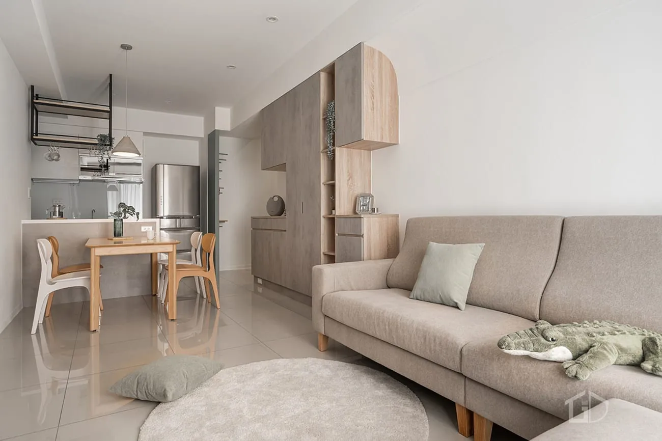大面積的收納櫃取代沉悶的牆,放大空間的無限可能,陽光從客廳的落地窗喚醒屋裡的生氣,拋開了繁雜,感受片刻的溫柔。