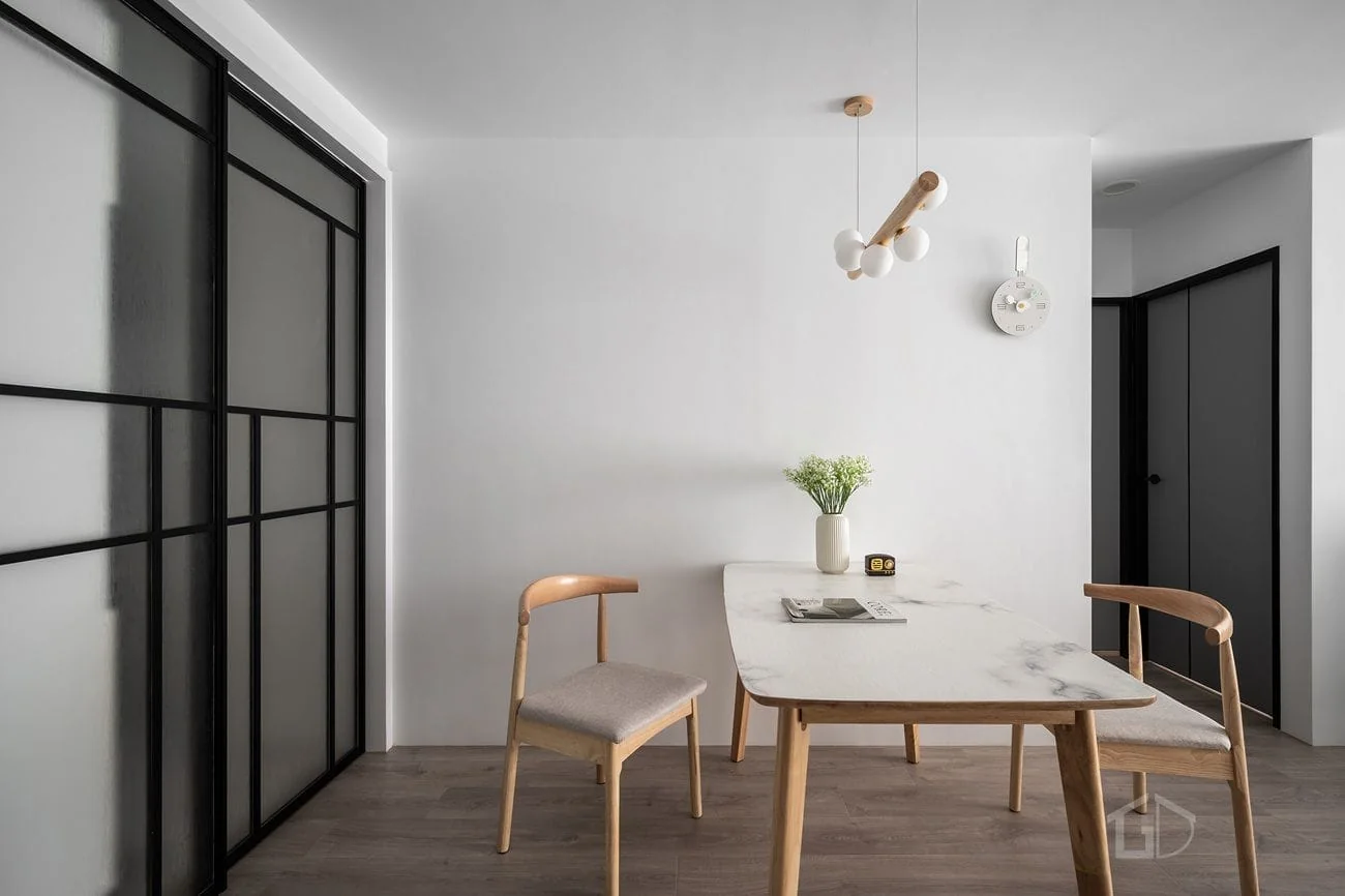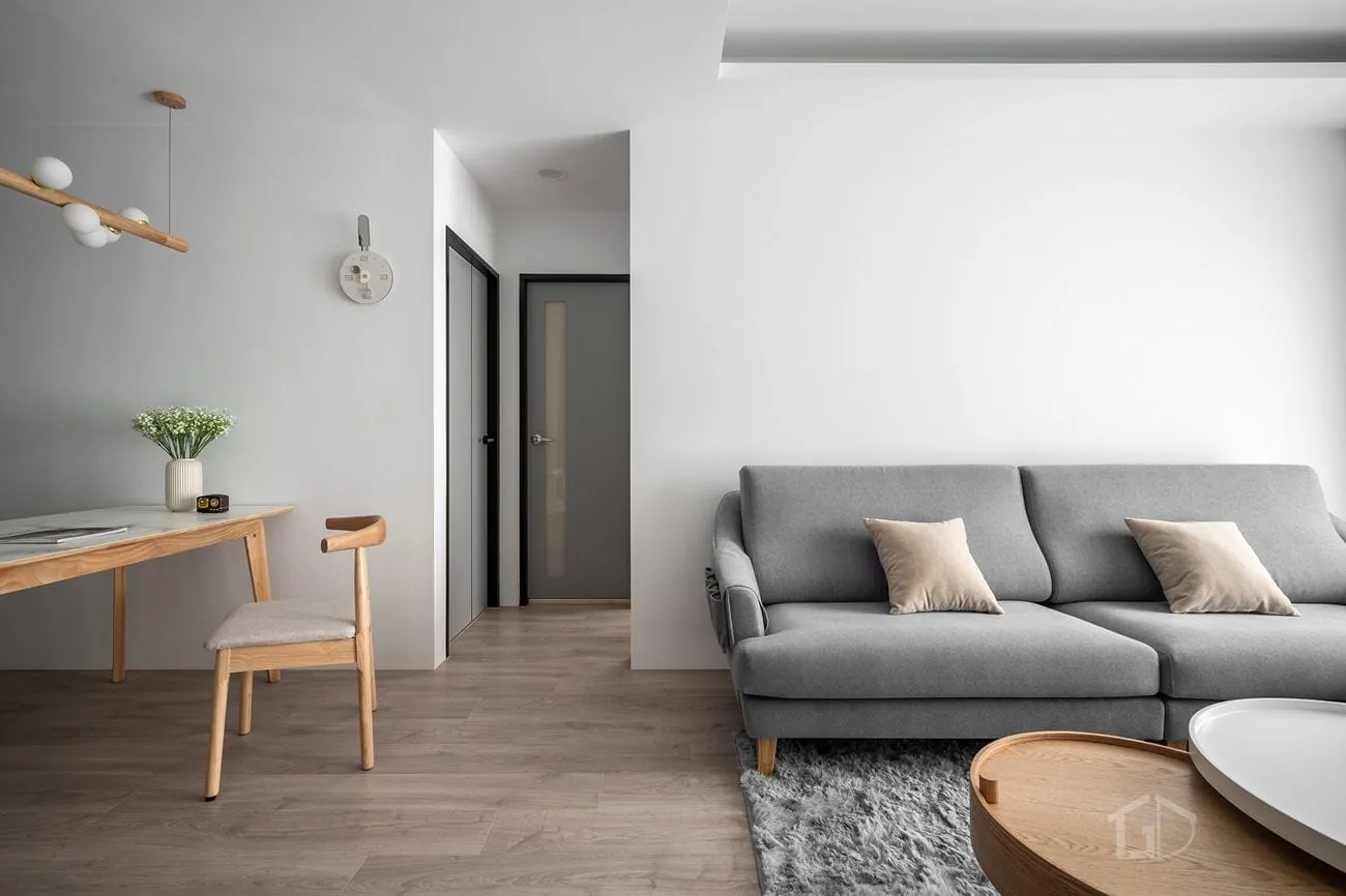 以木色渲染空間的溫潤氛圍,低飽和的綠意妝點出一抹清新,暖白與淺灰錯落有致,散佈於室,營造明亮而通透的愜意氣息。
