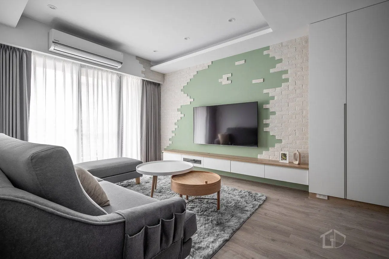 電視牆運用文化石描繪自然的樸實感,與嫩綠色的清爽與活力搭配,勾勒出視覺層次,也為生活多添幾許療癒。