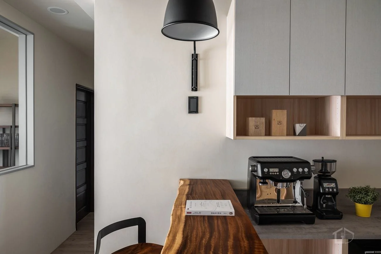 藉由玄關六角形花磚的帶領,進入低飽和色彩交織出的靜謐氛圍,搭配木作硬裝及軟裝,營造和煦溫潤,而天藍色的妝點更為空間帶來一抹清新,巧妙地與光線融合,明亮開闊而自在舒心,書房則運用透明玻璃打造為半開放式,延伸視覺比例,也消彌小空間的壓迫感。
