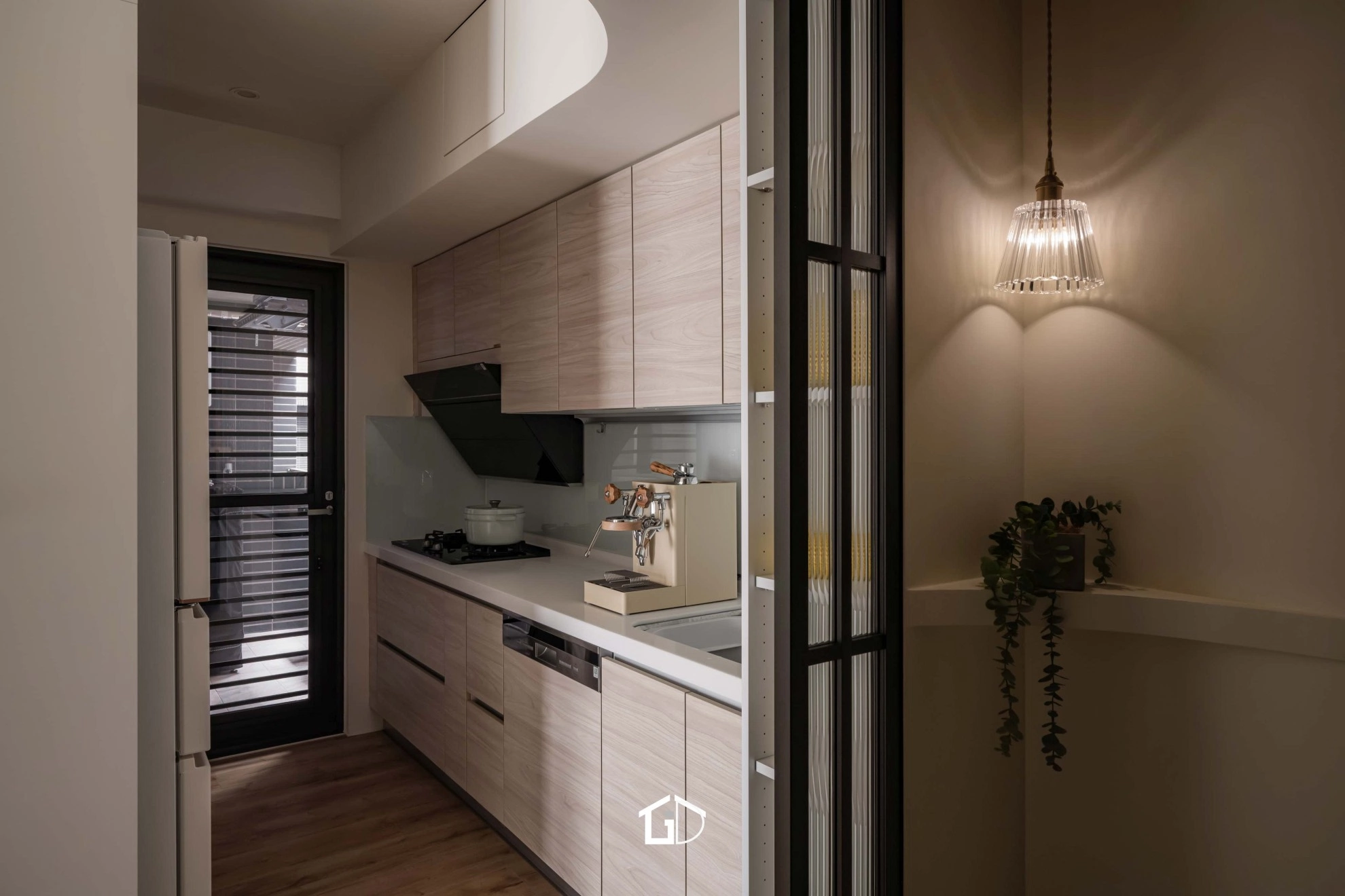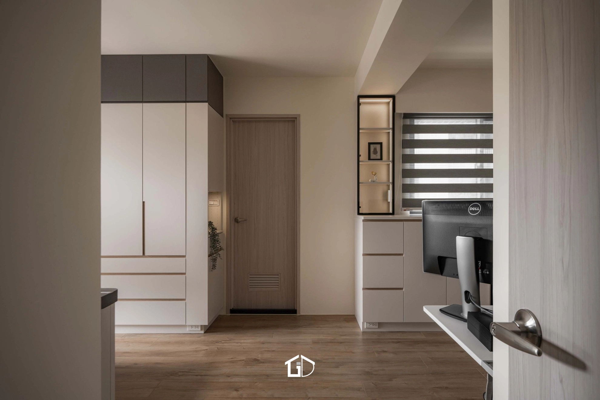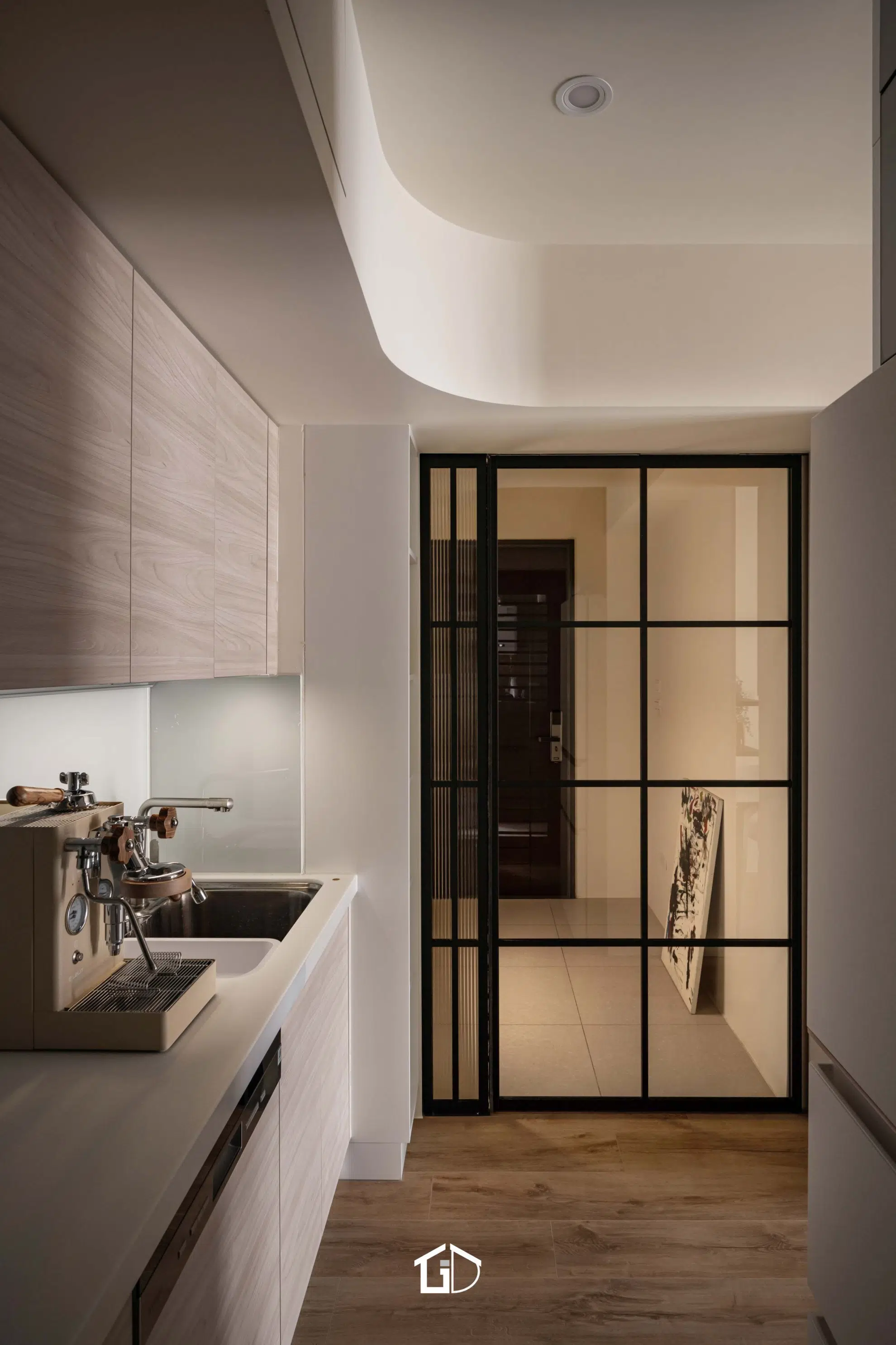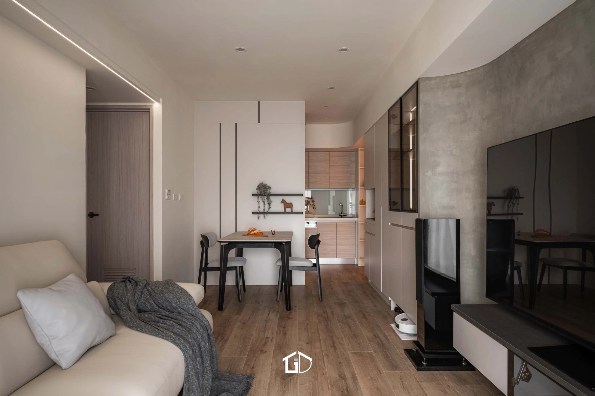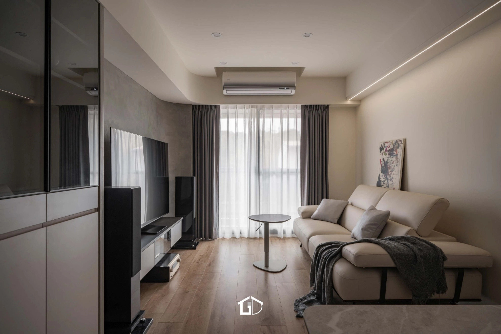 ● 主要建材:鋁框門、系統櫃、木地板、鋁槽燈、藝術塗料