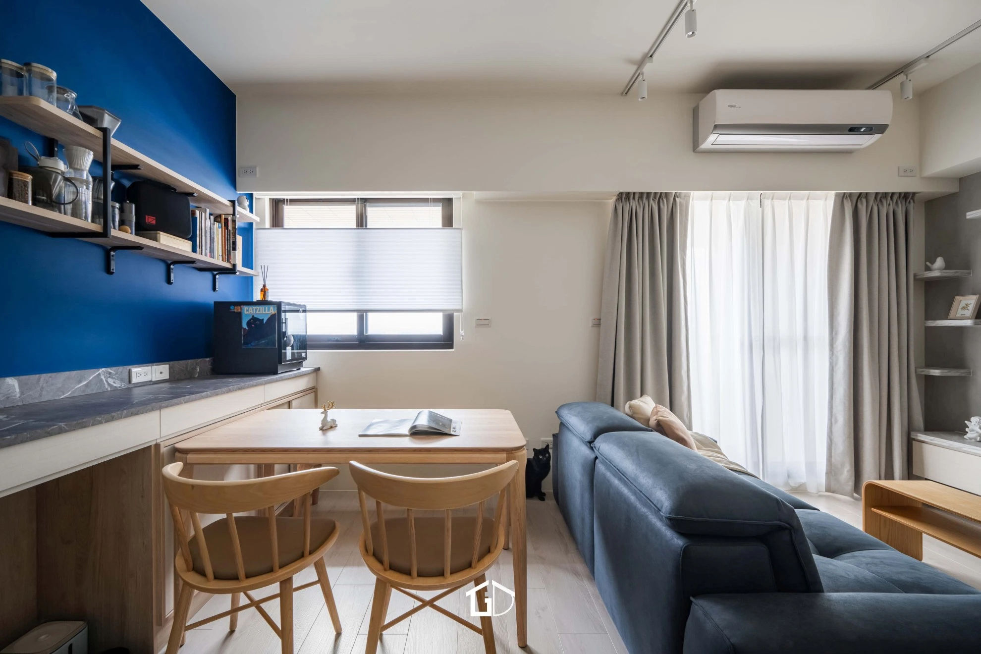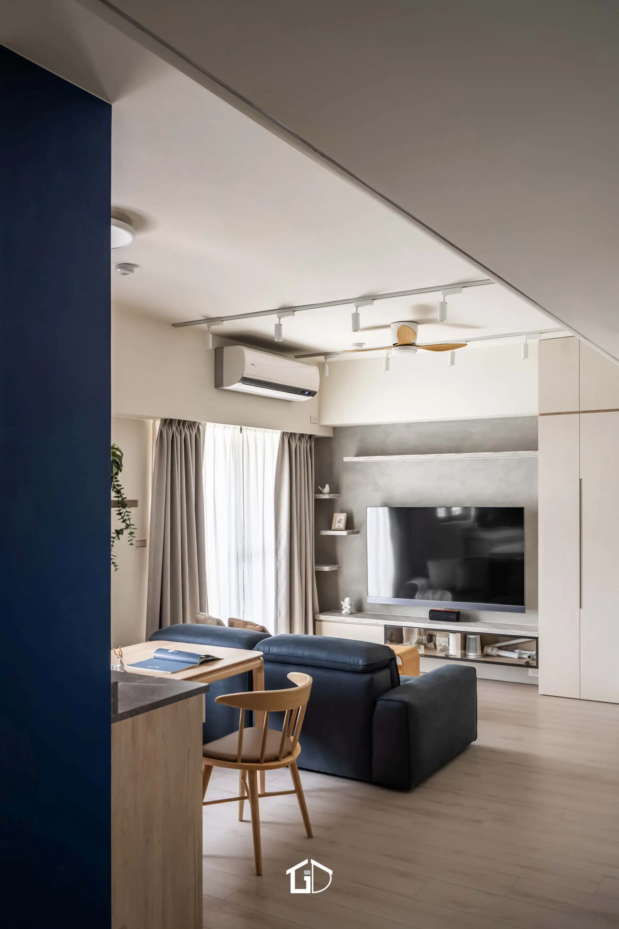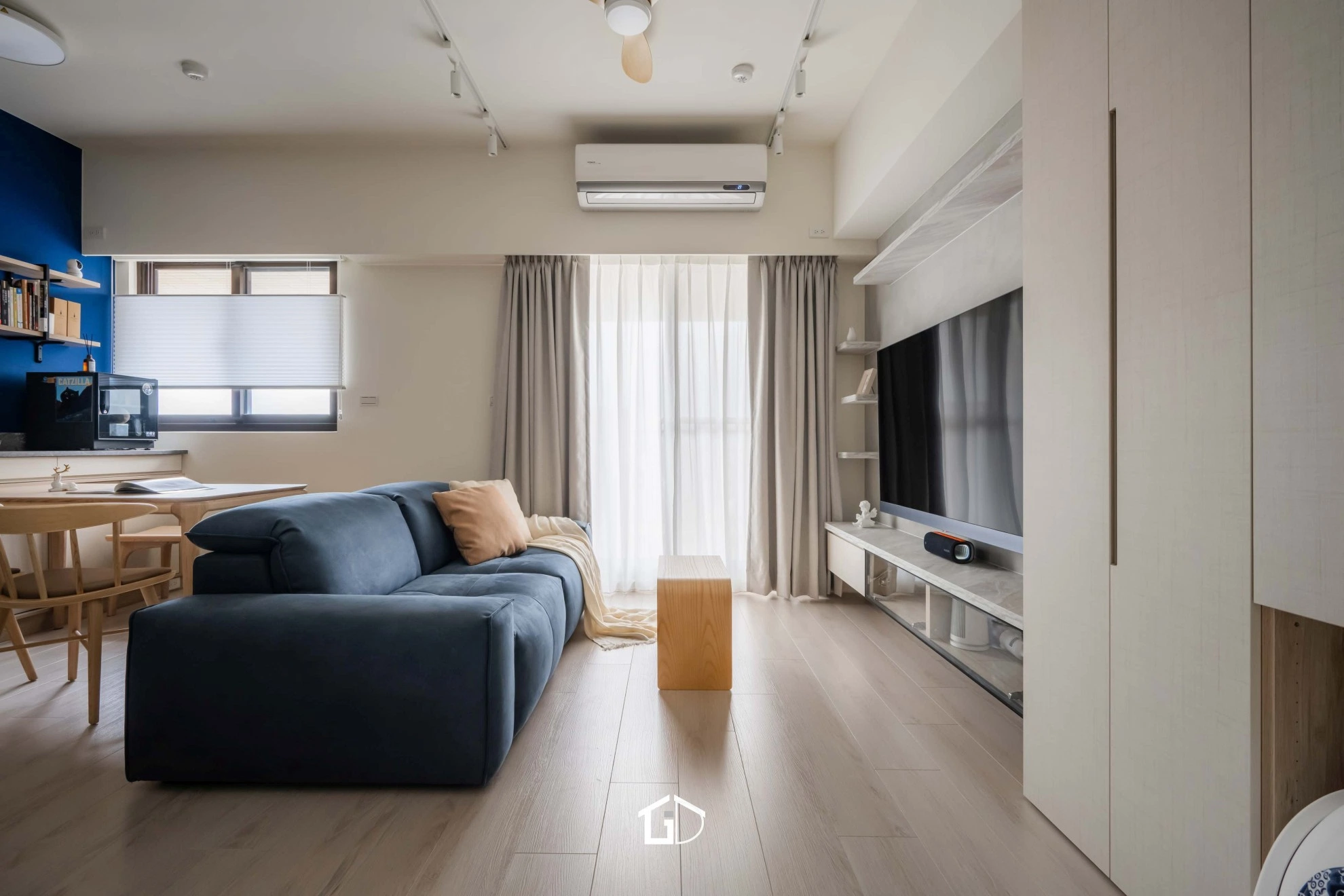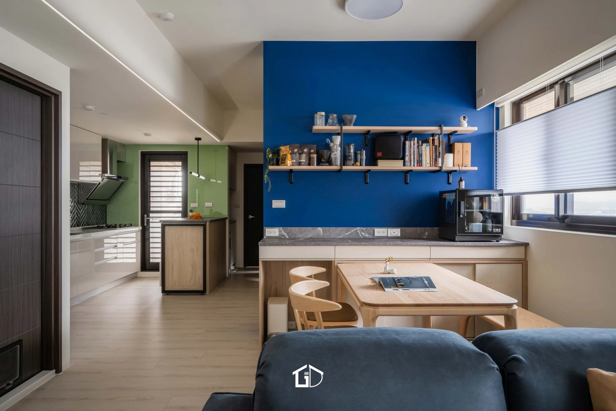 靛藍牆,一筆深邃。淺木紋,輕載溫度。墨綠魚骨磚,藏著光影的濃淡交錯☁️ 雙層簾幕,收起紛擾也留住光明