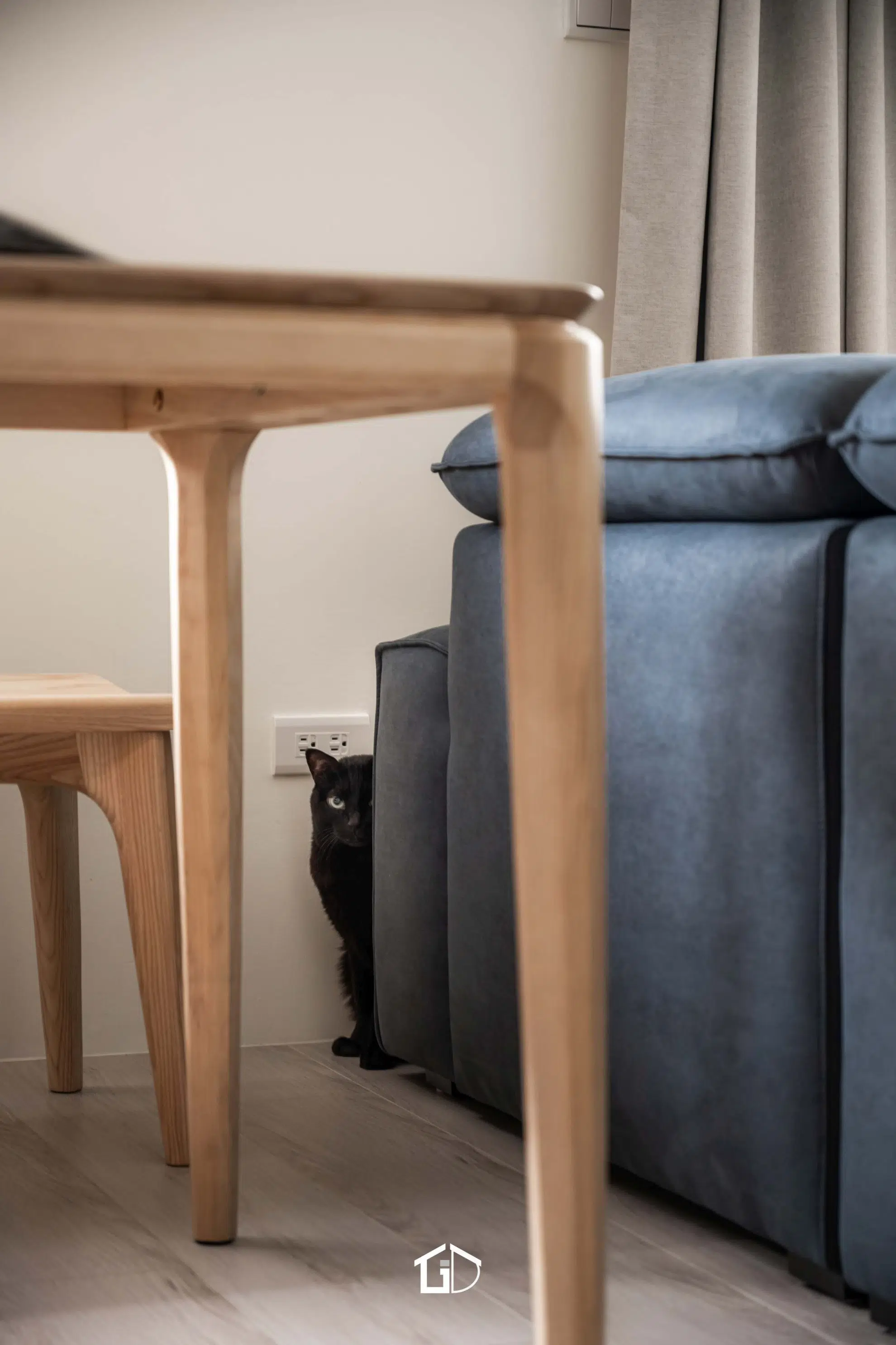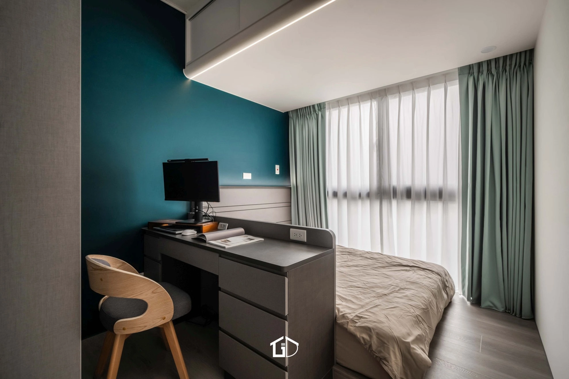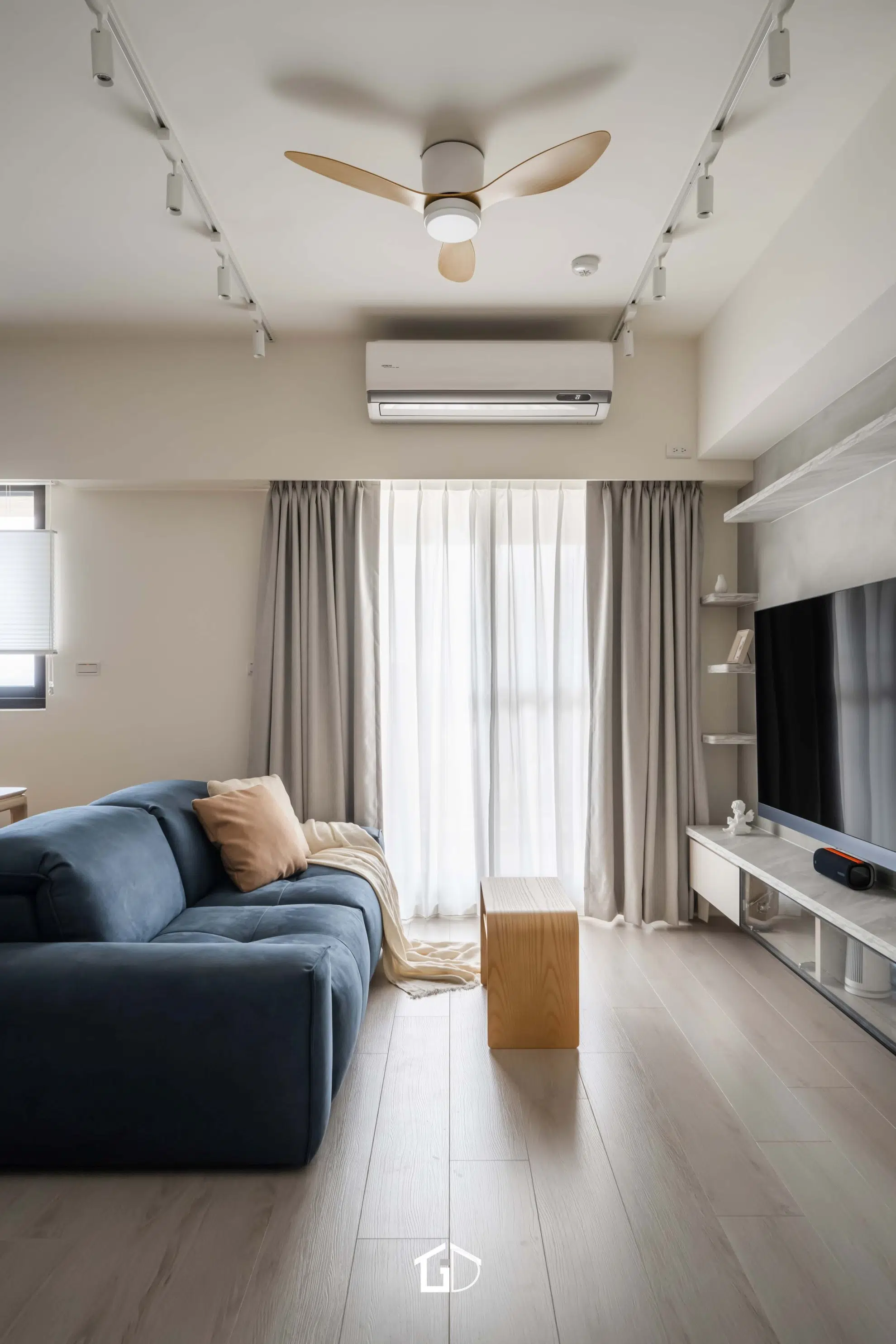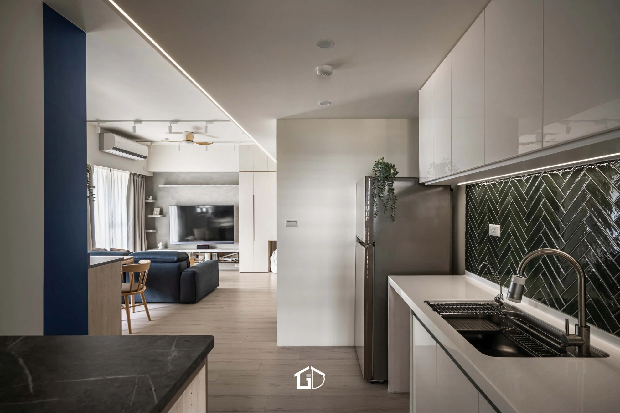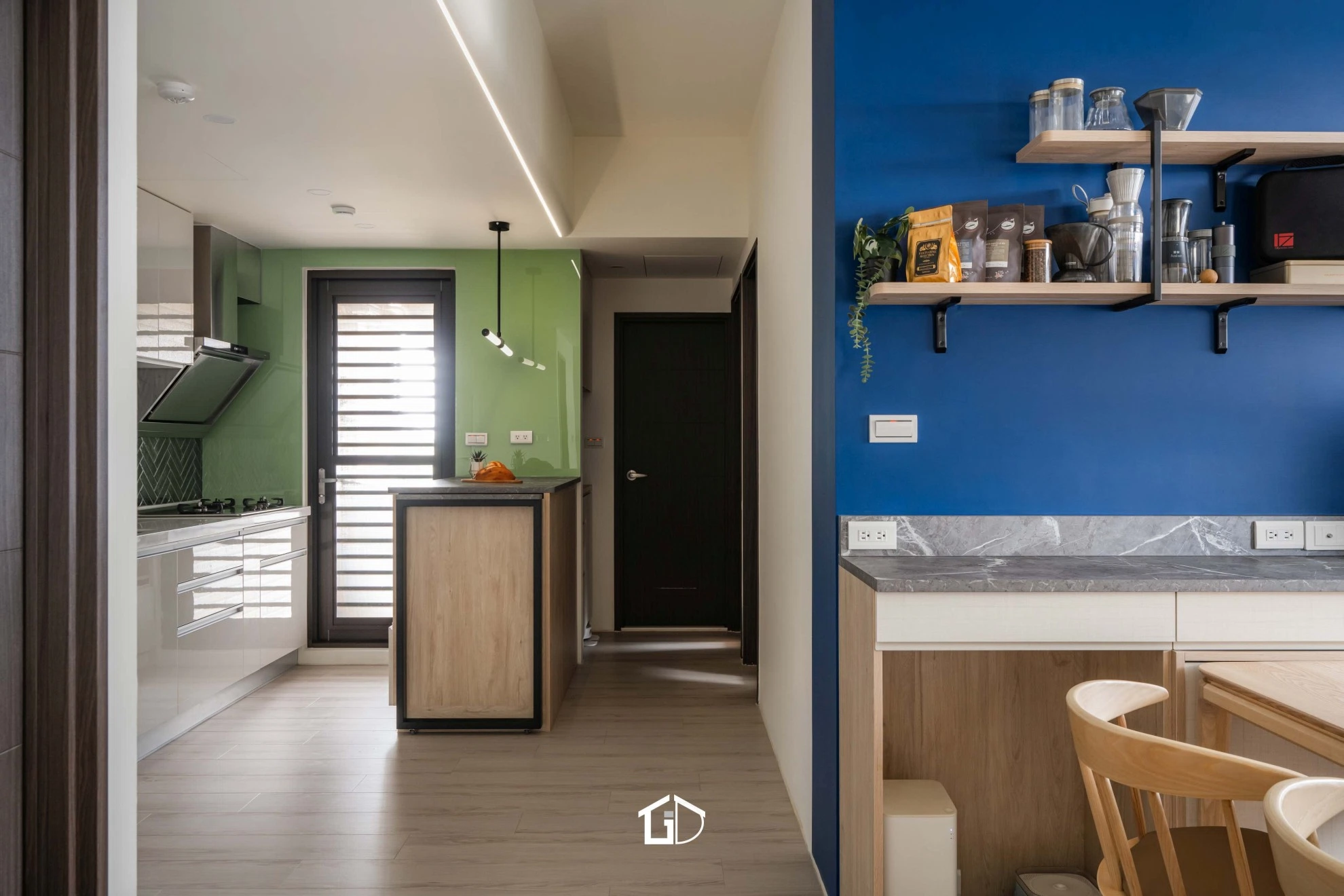 靛藍牆,一筆深邃。淺木紋,輕載溫度。墨綠魚骨磚,藏著光影的濃淡交錯☁️ 雙層簾幕,收起紛擾也留住光明