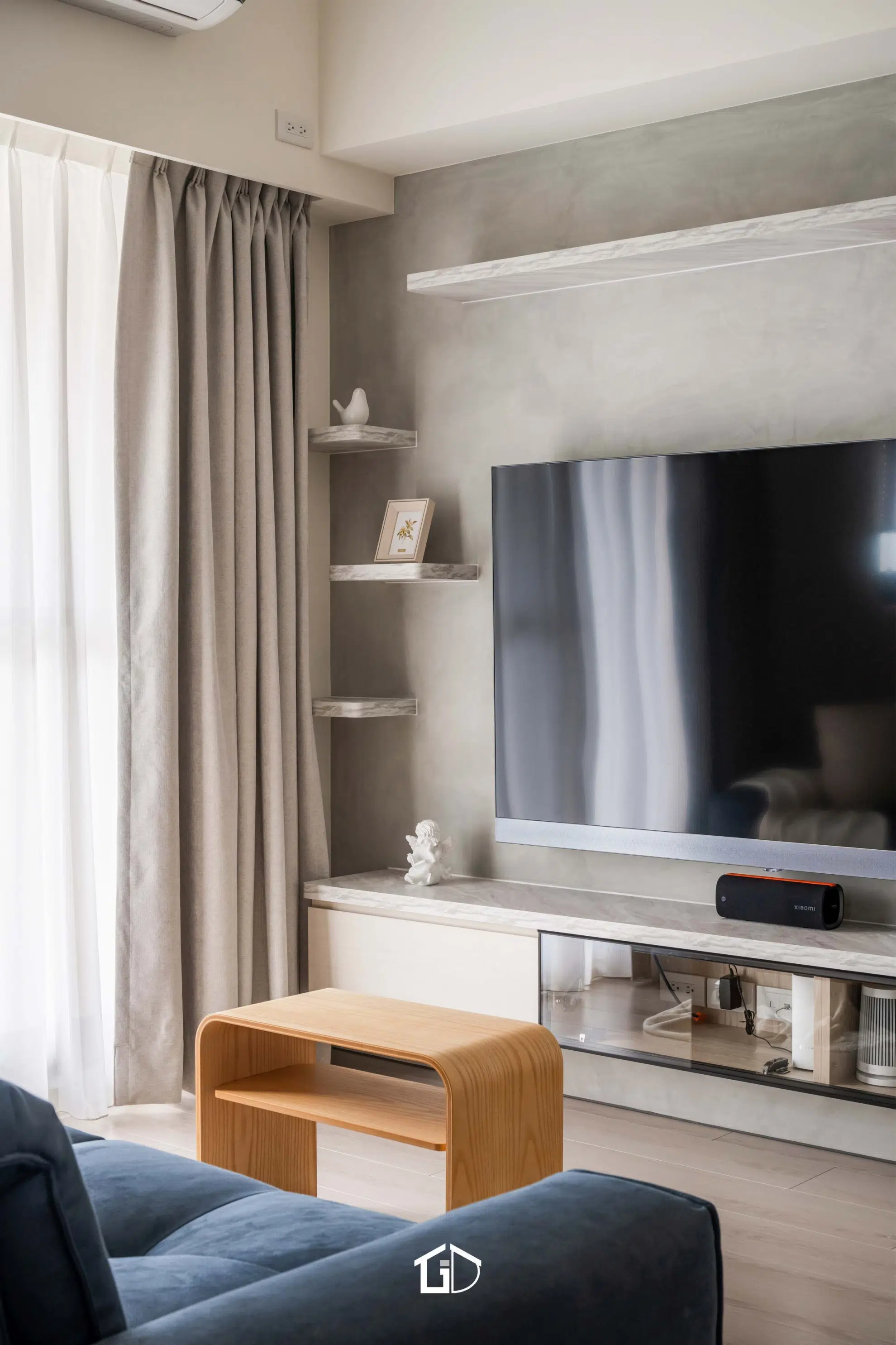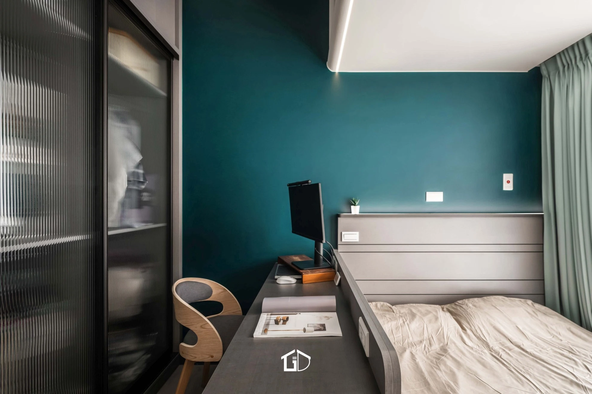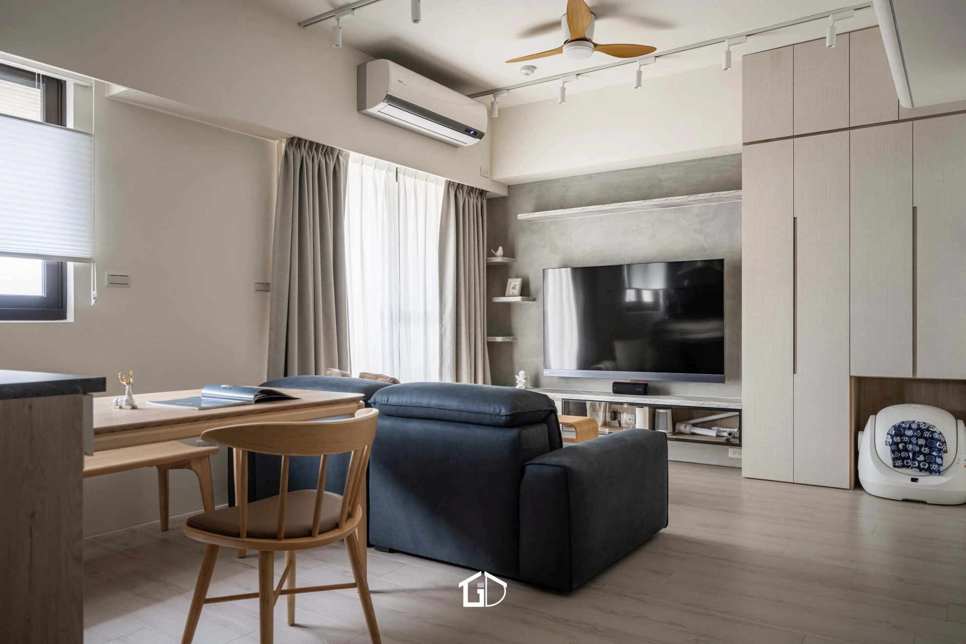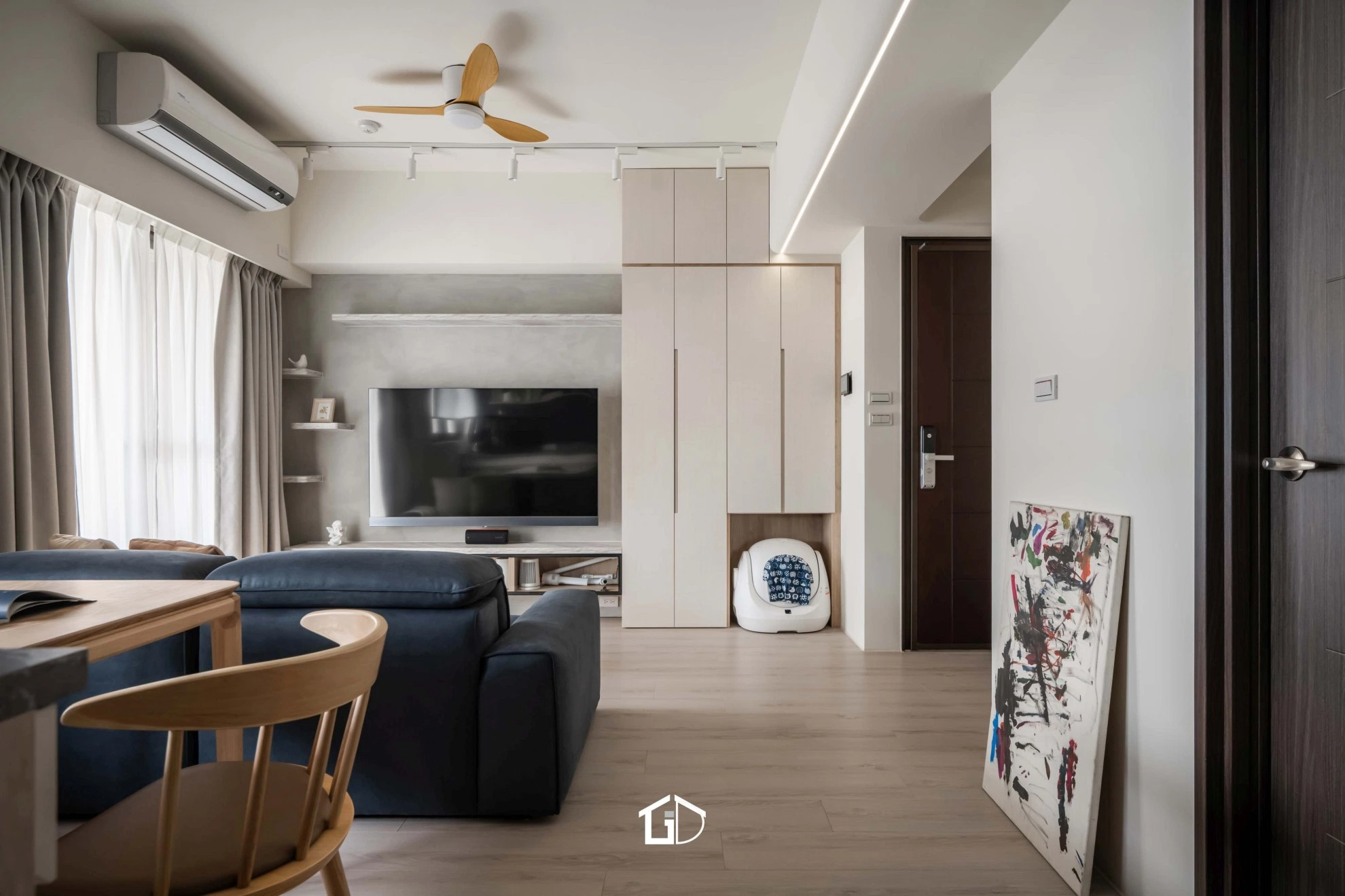 靛藍牆,一筆深邃。淺木紋,輕載溫度。墨綠魚骨磚,藏著光影的濃淡交錯☁️ 雙層簾幕,收起紛擾也留住光明