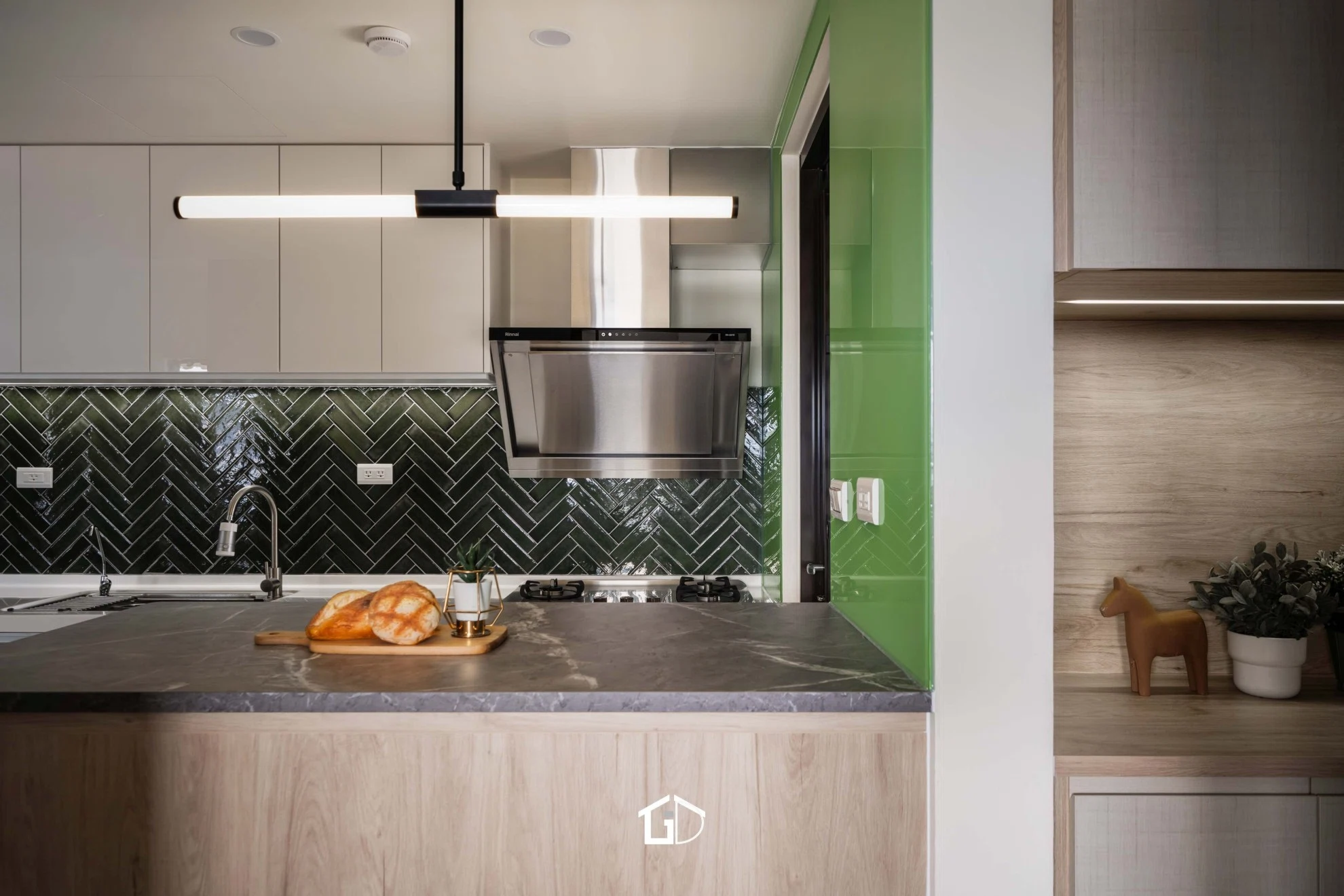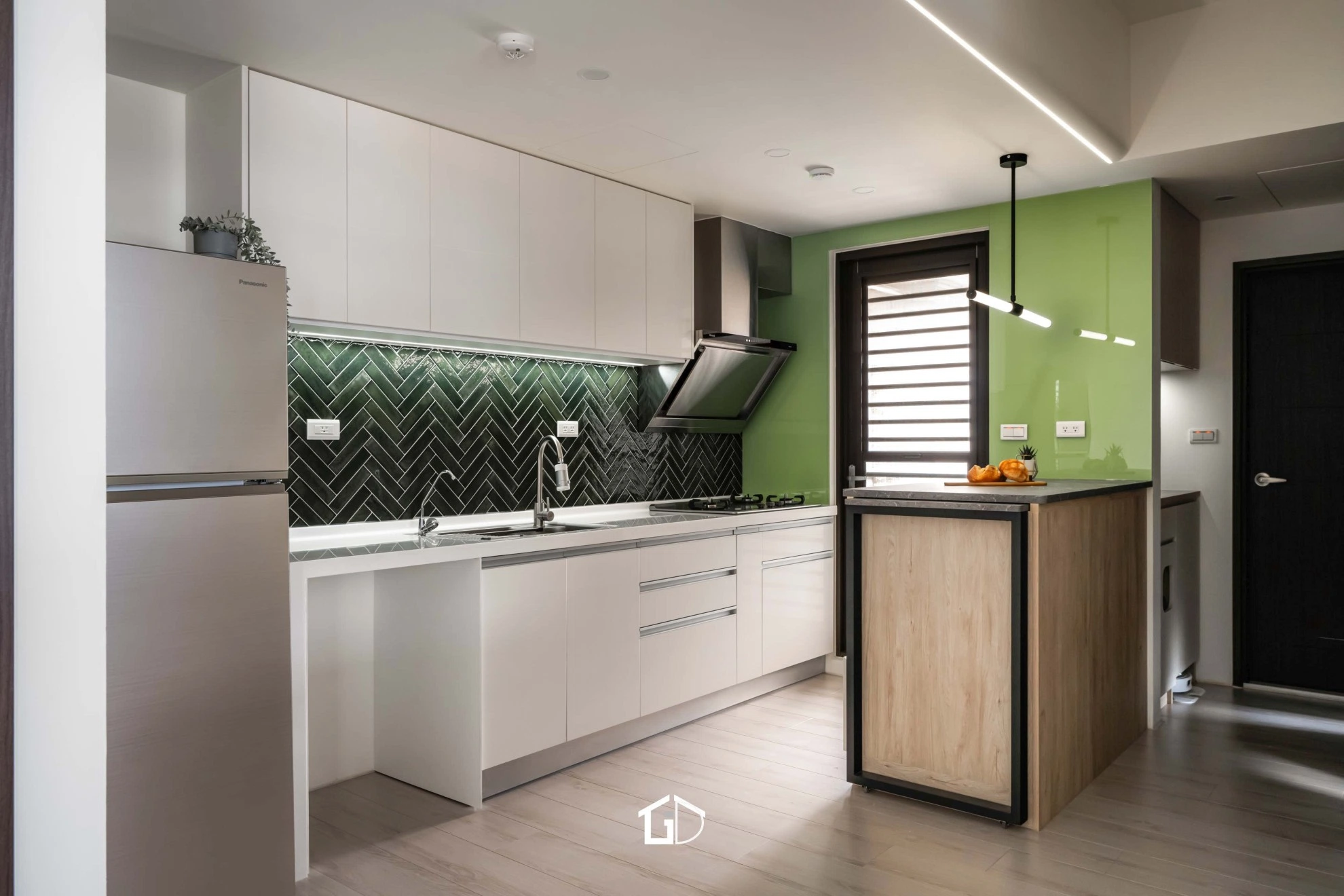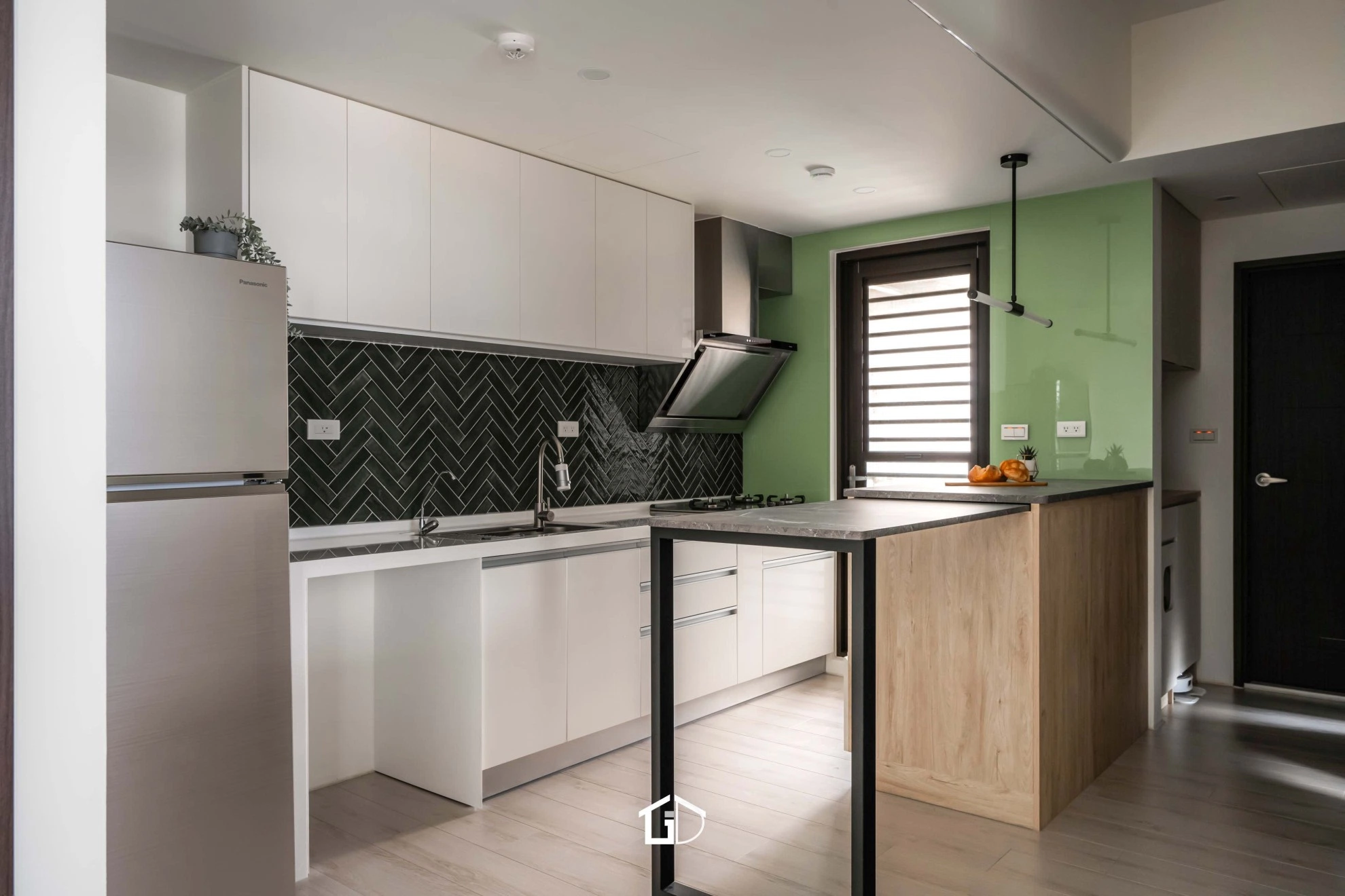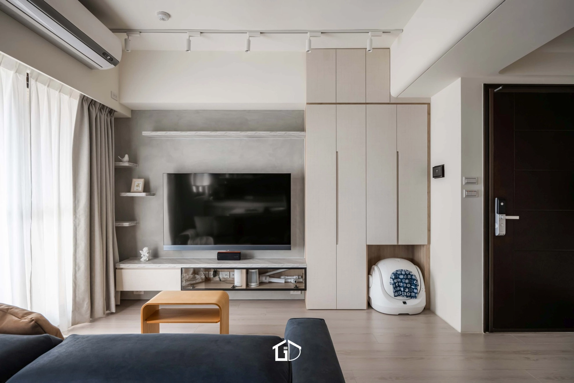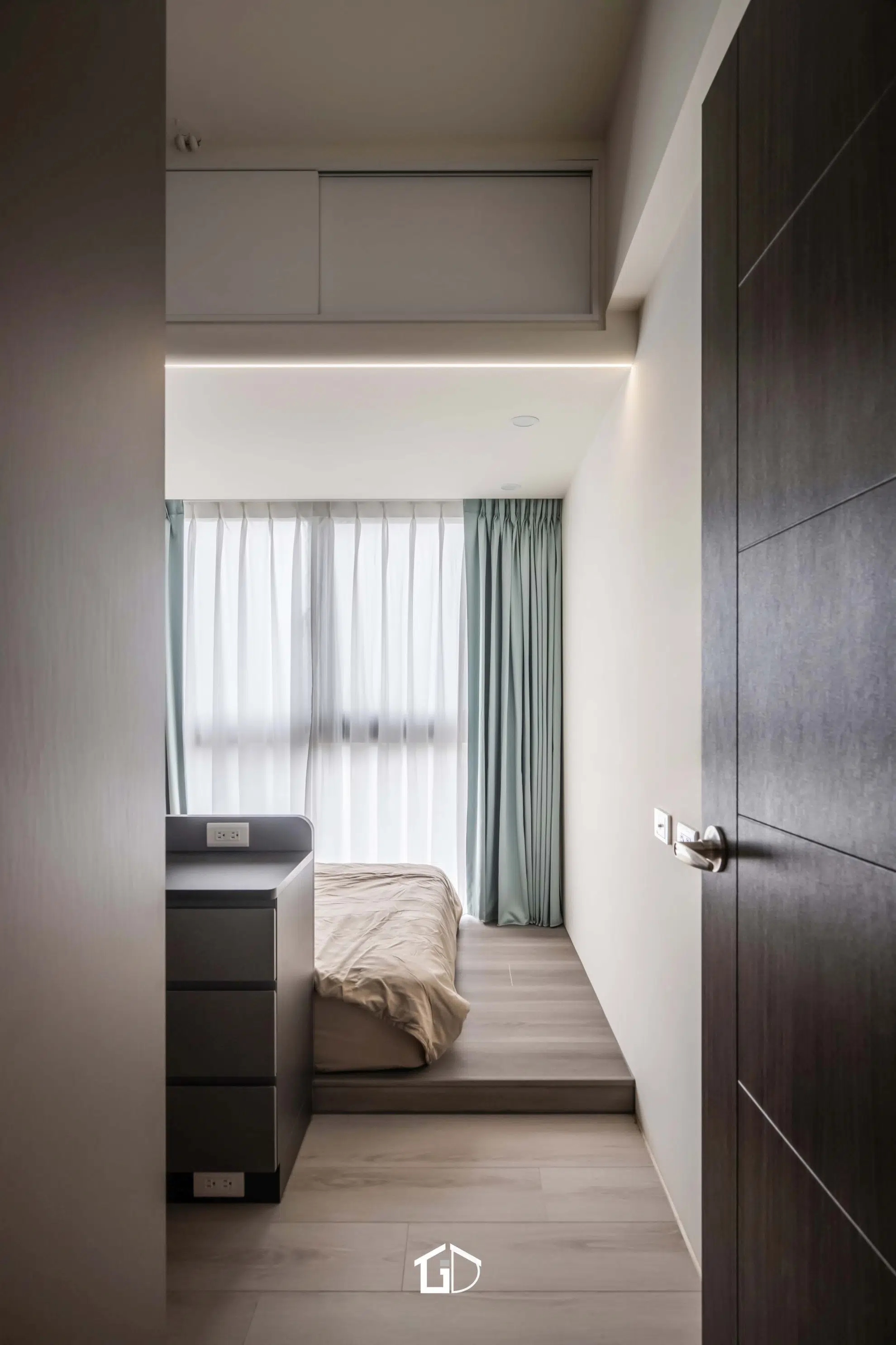 靛藍牆,一筆深邃。淺木紋,輕載溫度。墨綠魚骨磚,藏著光影的濃淡交錯☁️ 雙層簾幕,收起紛擾也留住光明