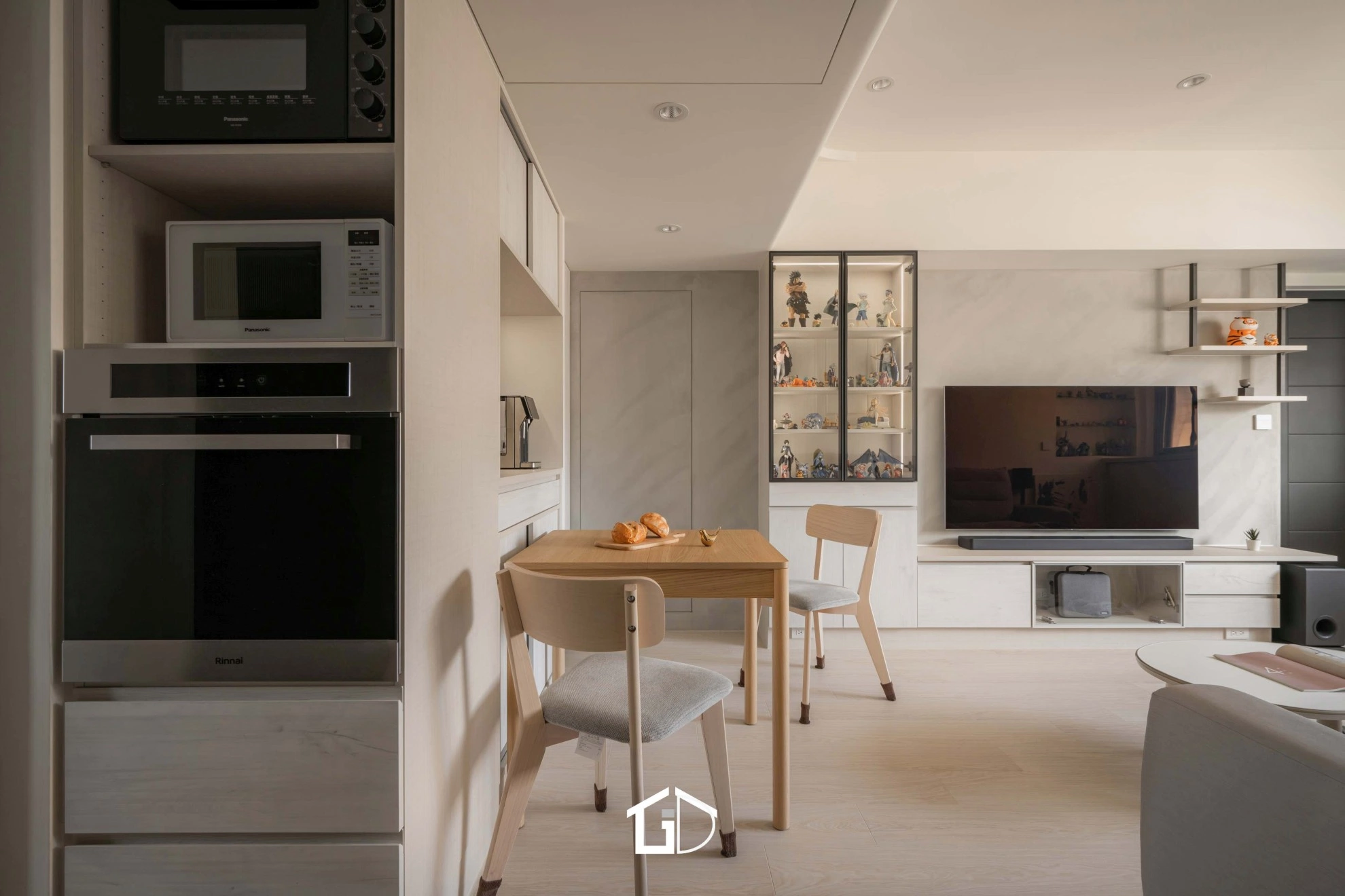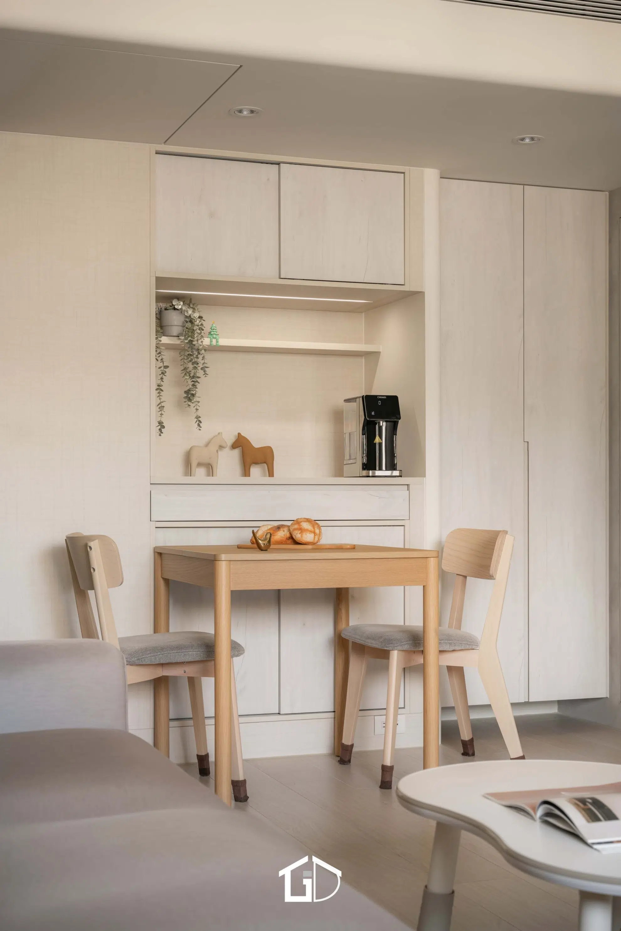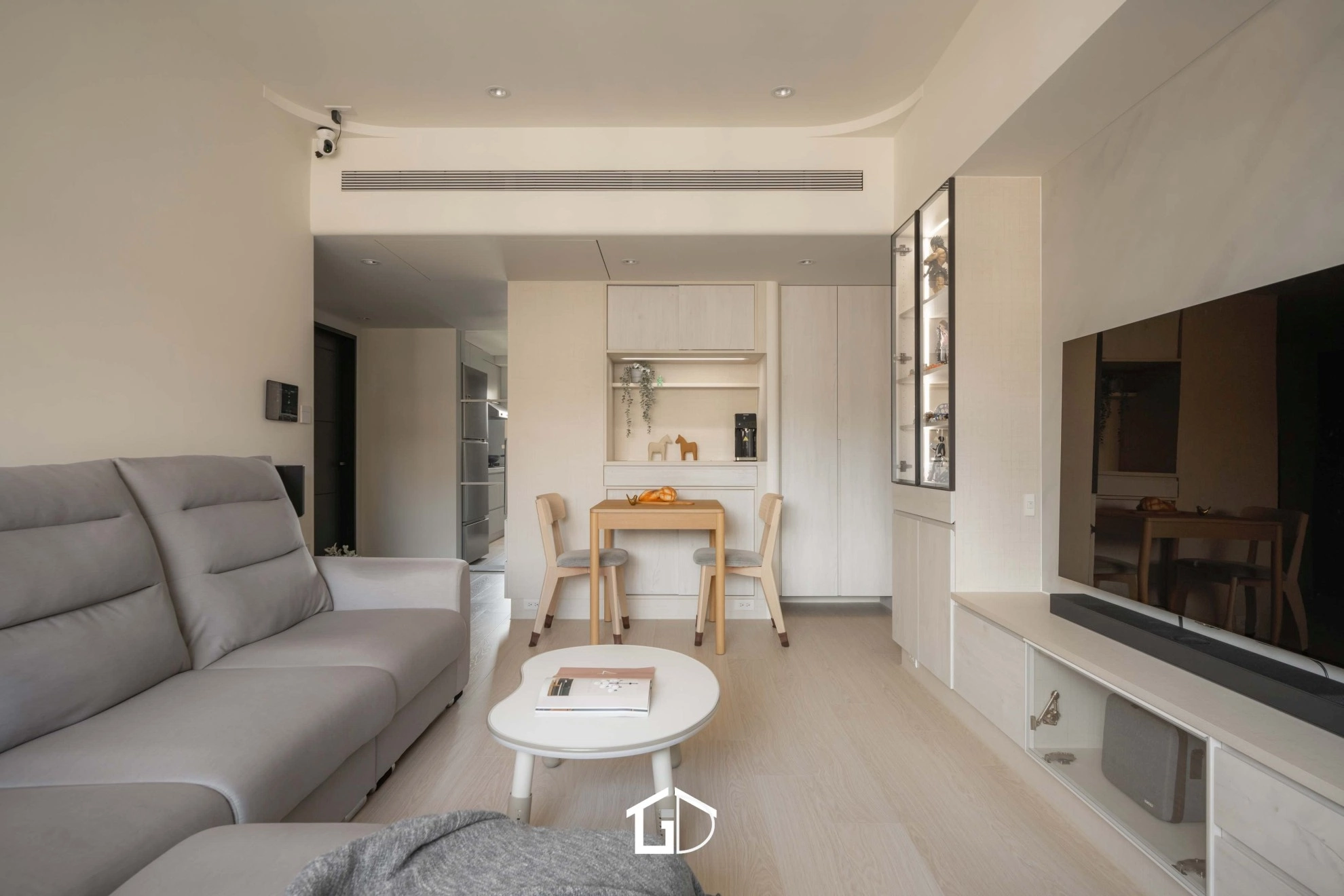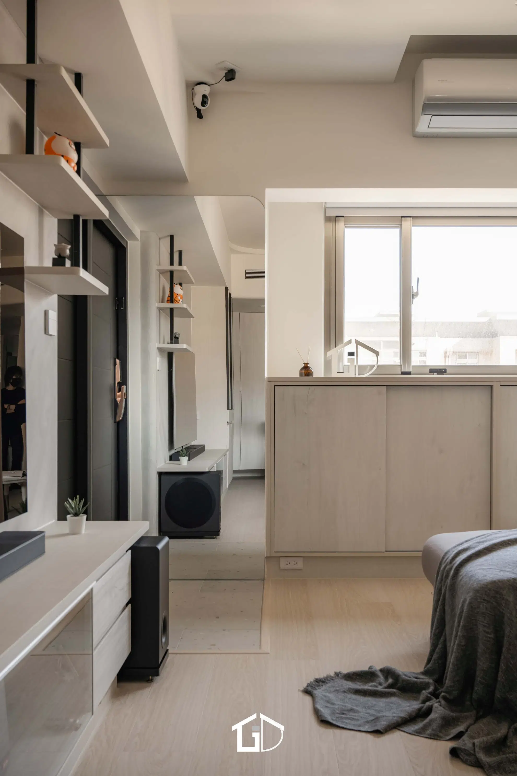 午光和煦,輕柔灑落在淺木與灰沙之間,為這個小宅注入如晨光般的恬靜氣息。電視牆採用柔霧特殊漆質感,搭配鐵件層架與玻璃櫃體,讓展示與收納自然交織,不顯壓迫。整體以低彩溫潤色階鋪陳,灰米色沙發、裸木色家具與奶油白收納系統,映出北歐簡約而溫柔的生活軌跡。窗邊小圓几與微型餐桌構成日常的光影座標,細節處處透露「剛剛好」的從容。這是一個為當代小宅量身訂製的靜謐容器,留給居住者更多生活的餘白與心靈的緩衝。