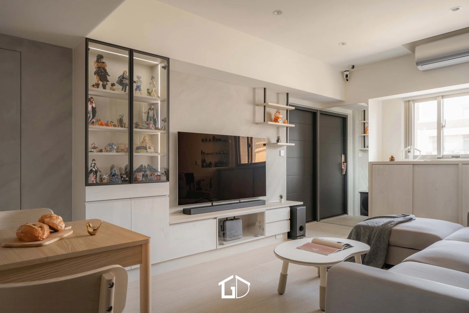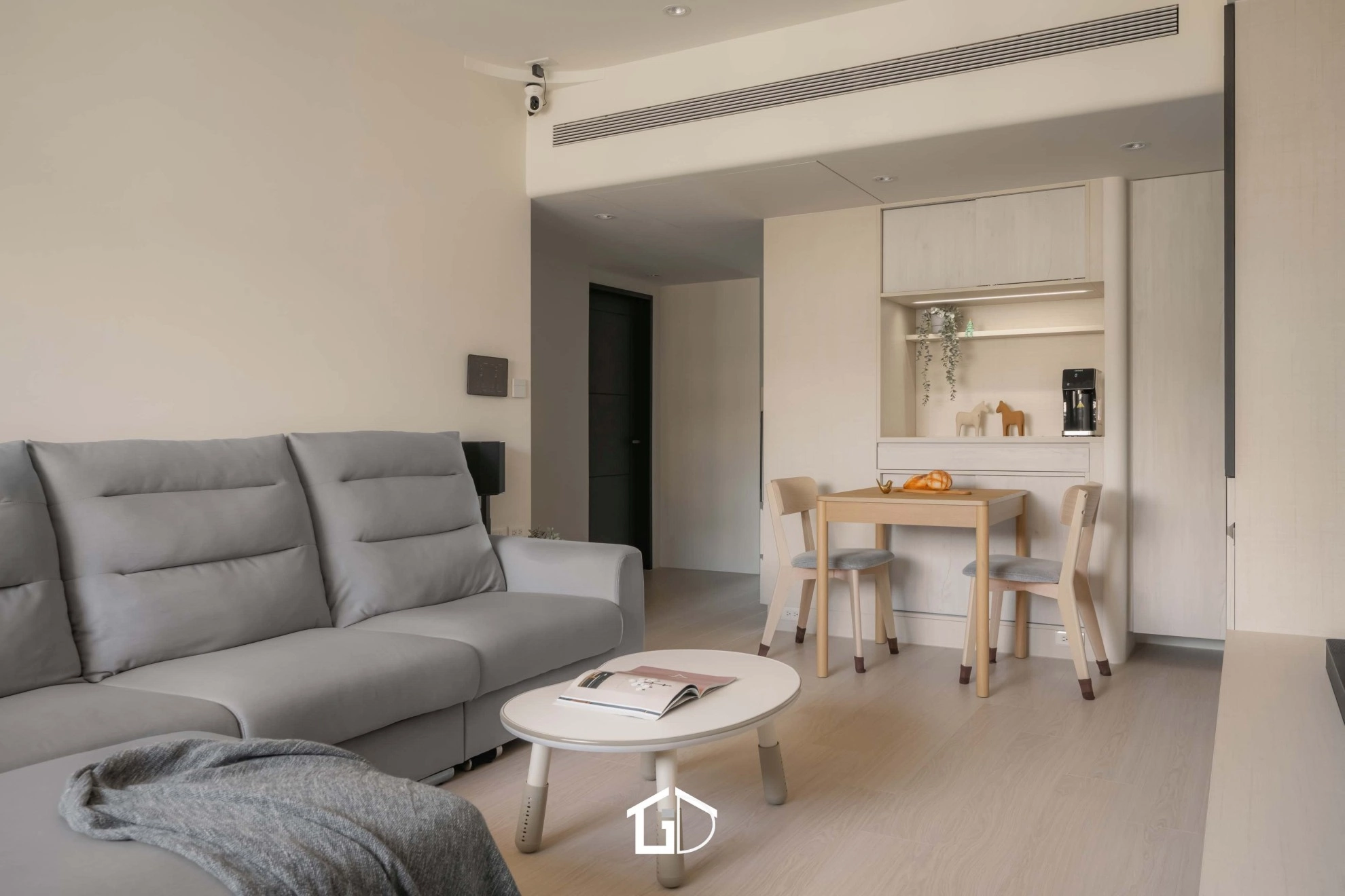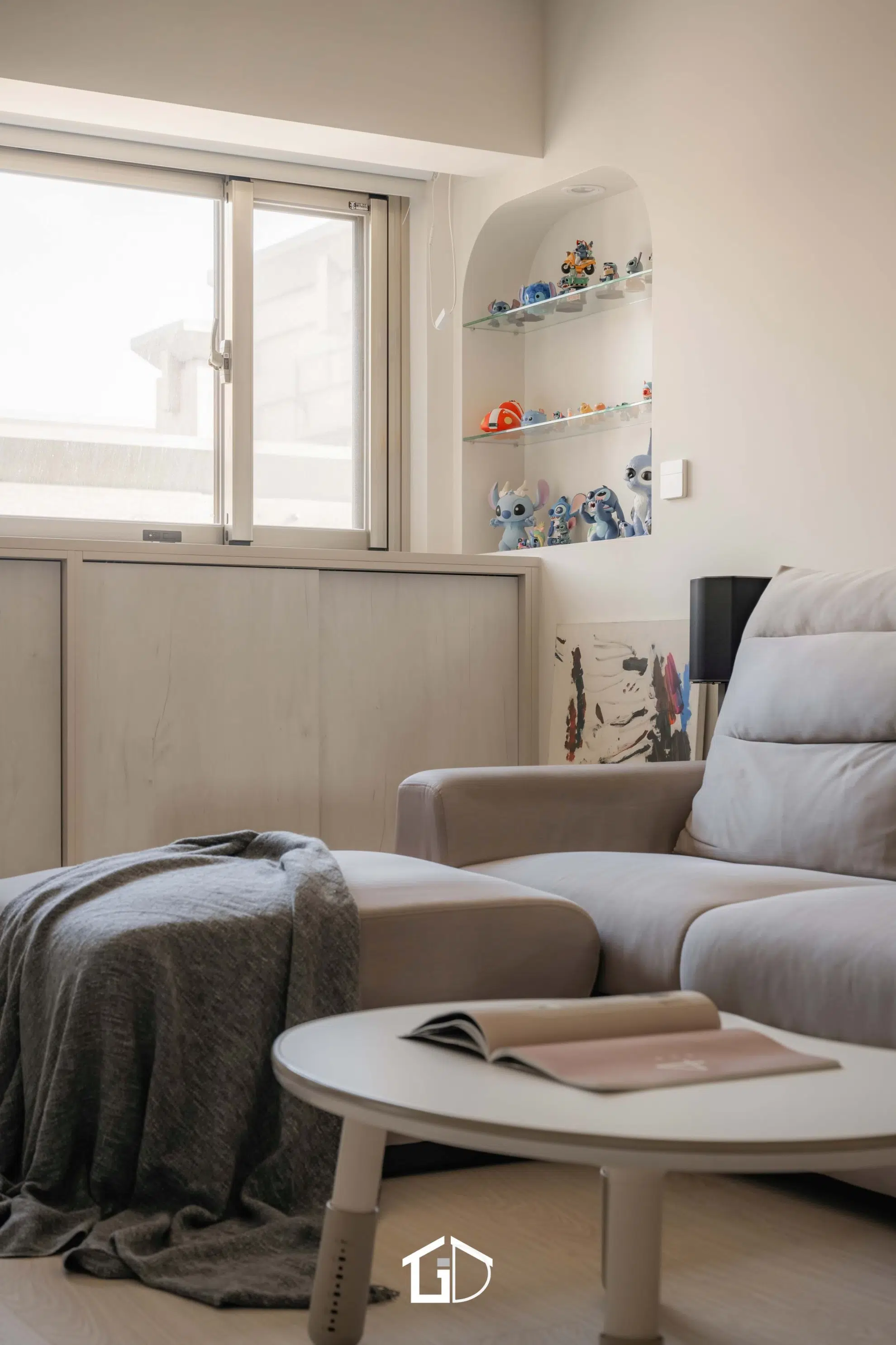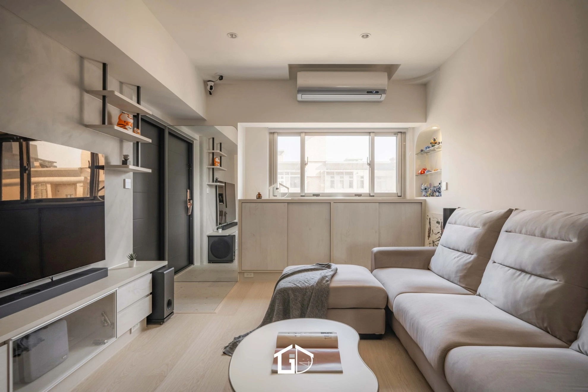 午光和煦,輕柔灑落在淺木與灰沙之間,為這個小宅注入如晨光般的恬靜氣息。電視牆採用柔霧特殊漆質感,搭配鐵件層架與玻璃櫃體,讓展示與收納自然交織,不顯壓迫。整體以低彩溫潤色階鋪陳,灰米色沙發、裸木色家具與奶油白收納系統,映出北歐簡約而溫柔的生活軌跡。窗邊小圓几與微型餐桌構成日常的光影座標,細節處處透露「剛剛好」的從容。這是一個為當代小宅量身訂製的靜謐容器,留給居住者更多生活的餘白與心靈的緩衝。
