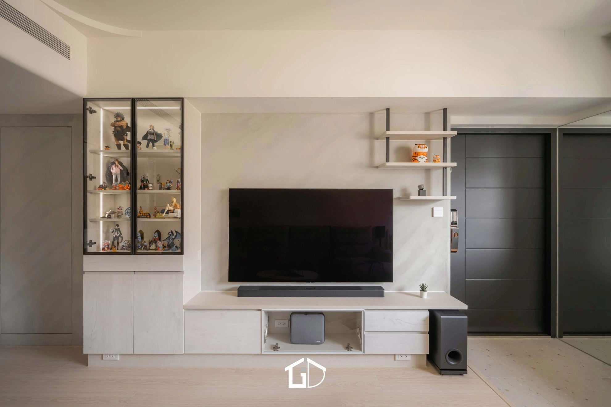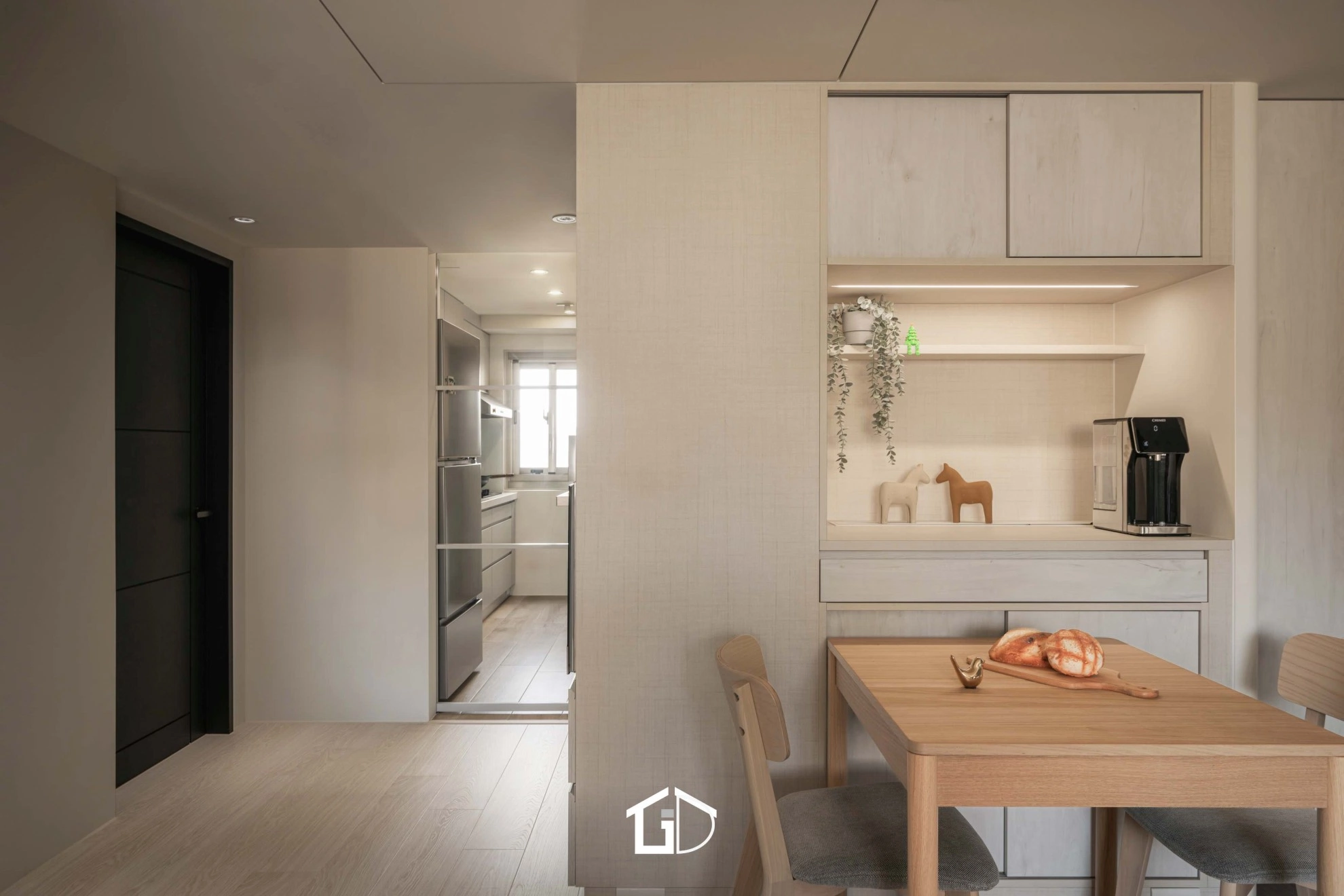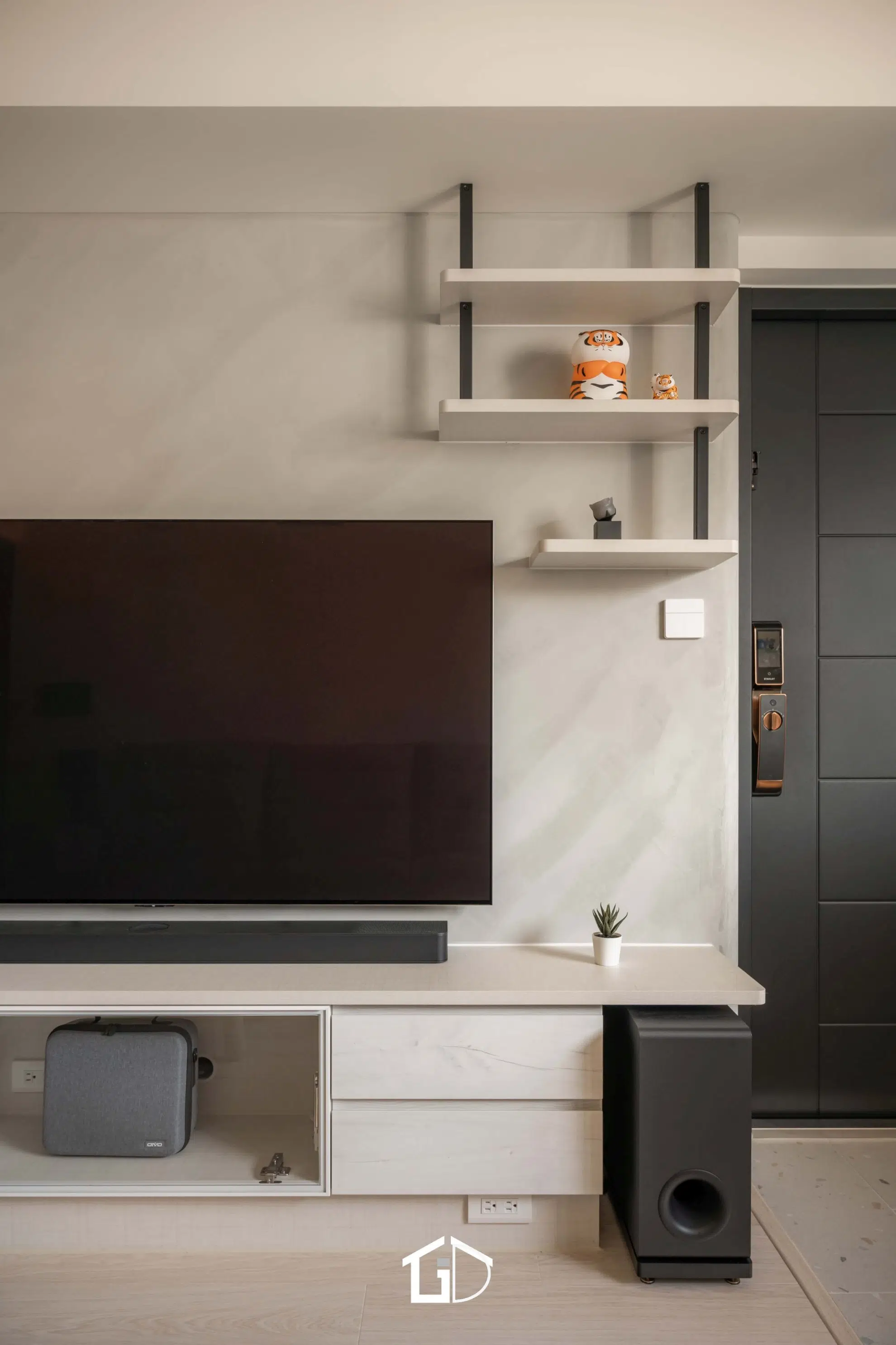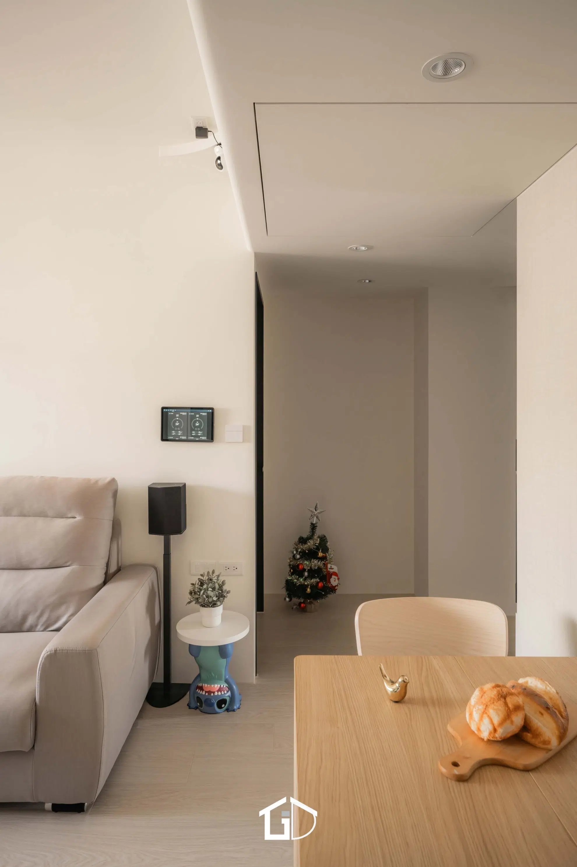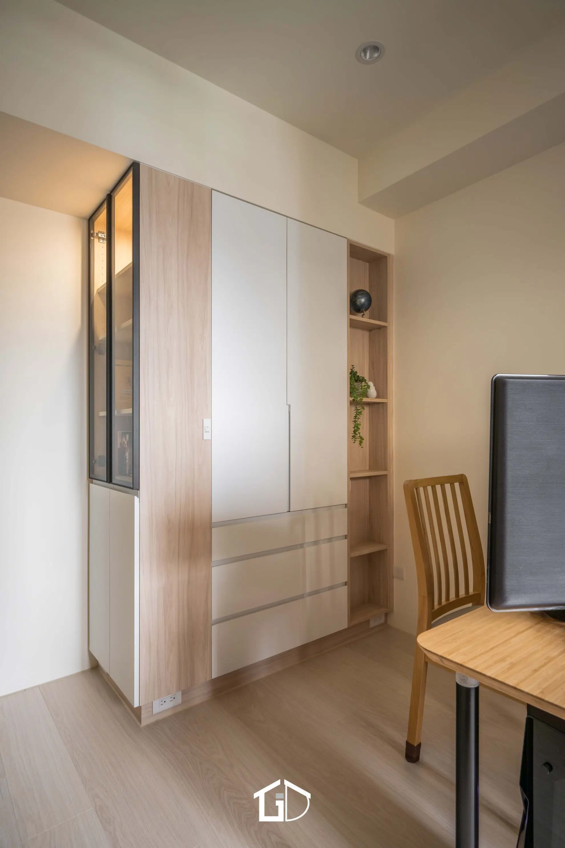 午光和煦,輕柔灑落在淺木與灰沙之間,為這個小宅注入如晨光般的恬靜氣息。電視牆採用柔霧特殊漆質感,搭配鐵件層架與玻璃櫃體,讓展示與收納自然交織,不顯壓迫。整體以低彩溫潤色階鋪陳,灰米色沙發、裸木色家具與奶油白收納系統,映出北歐簡約而溫柔的生活軌跡。窗邊小圓几與微型餐桌構成日常的光影座標,細節處處透露「剛剛好」的從容。這是一個為當代小宅量身訂製的靜謐容器,留給居住者更多生活的餘白與心靈的緩衝。
