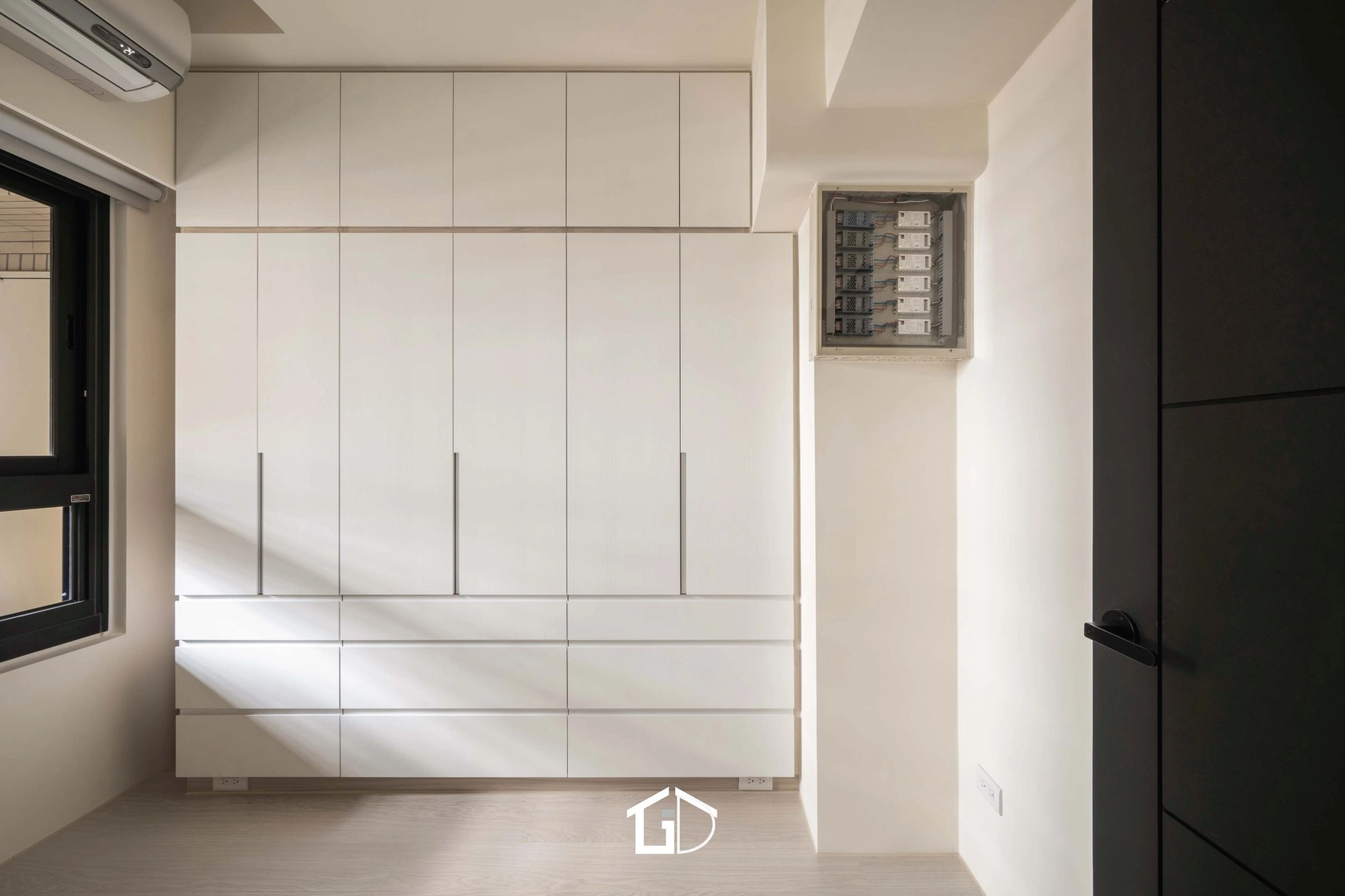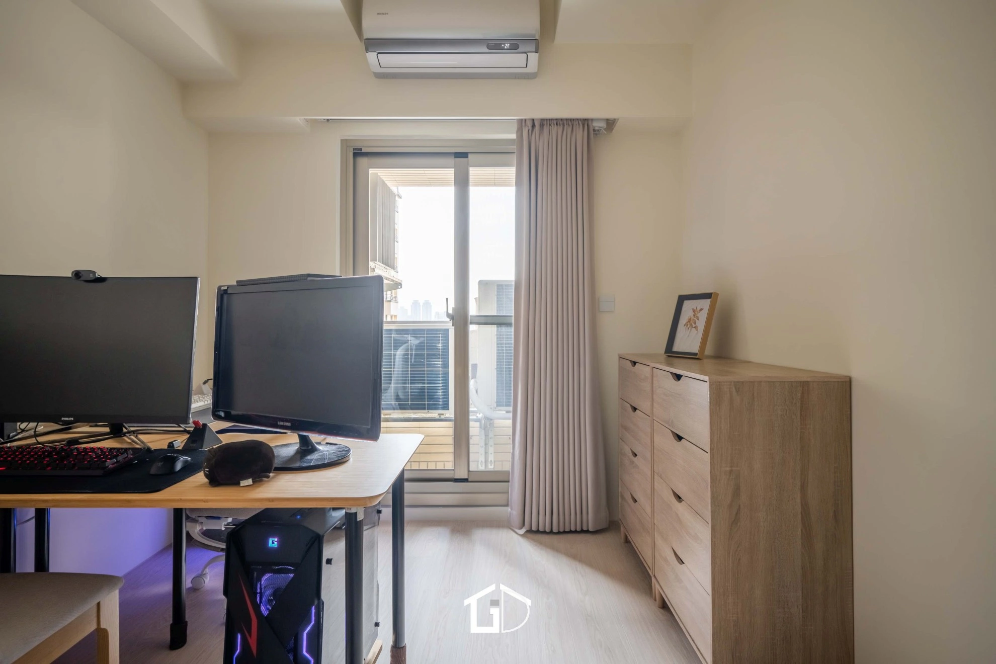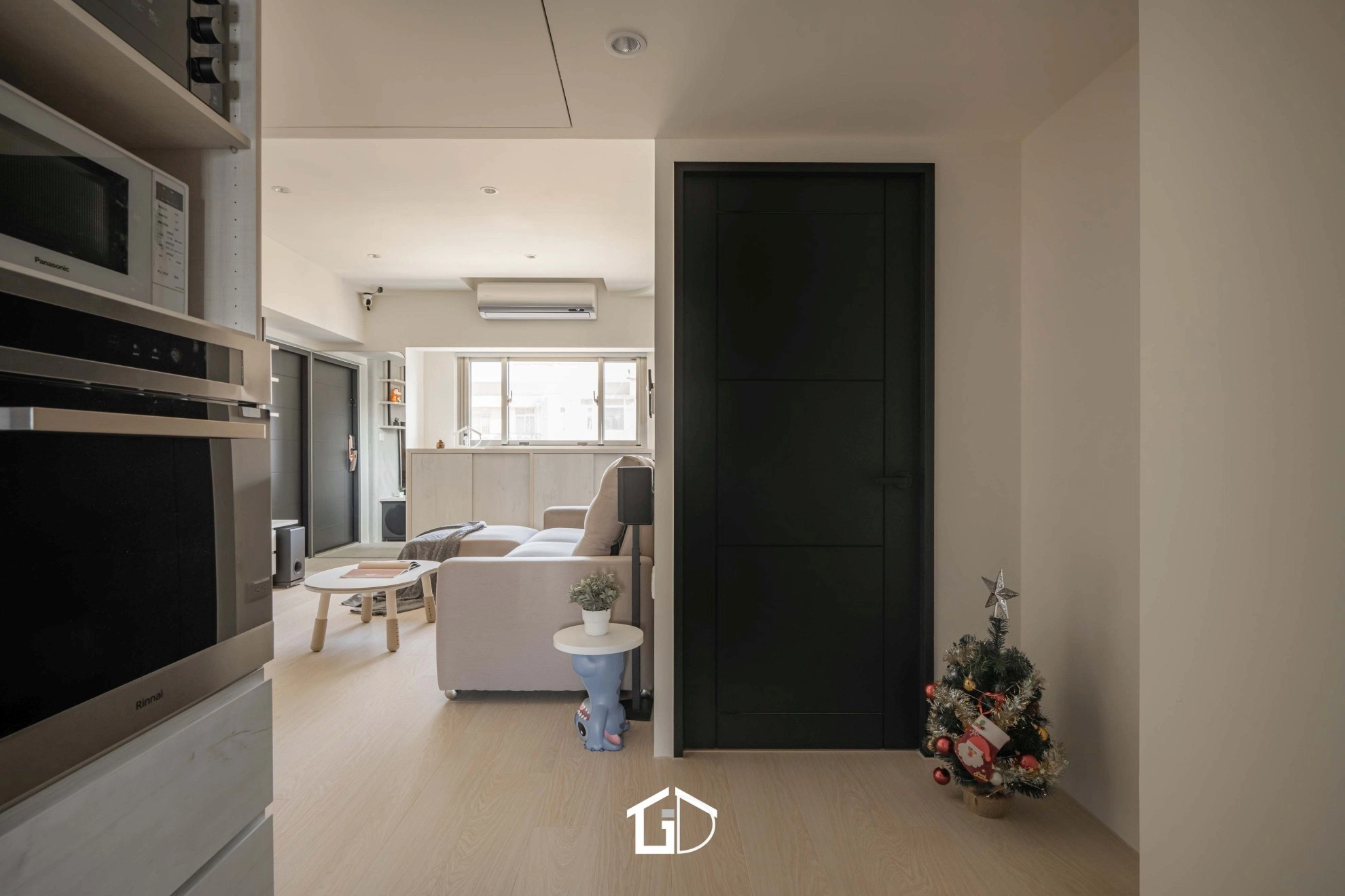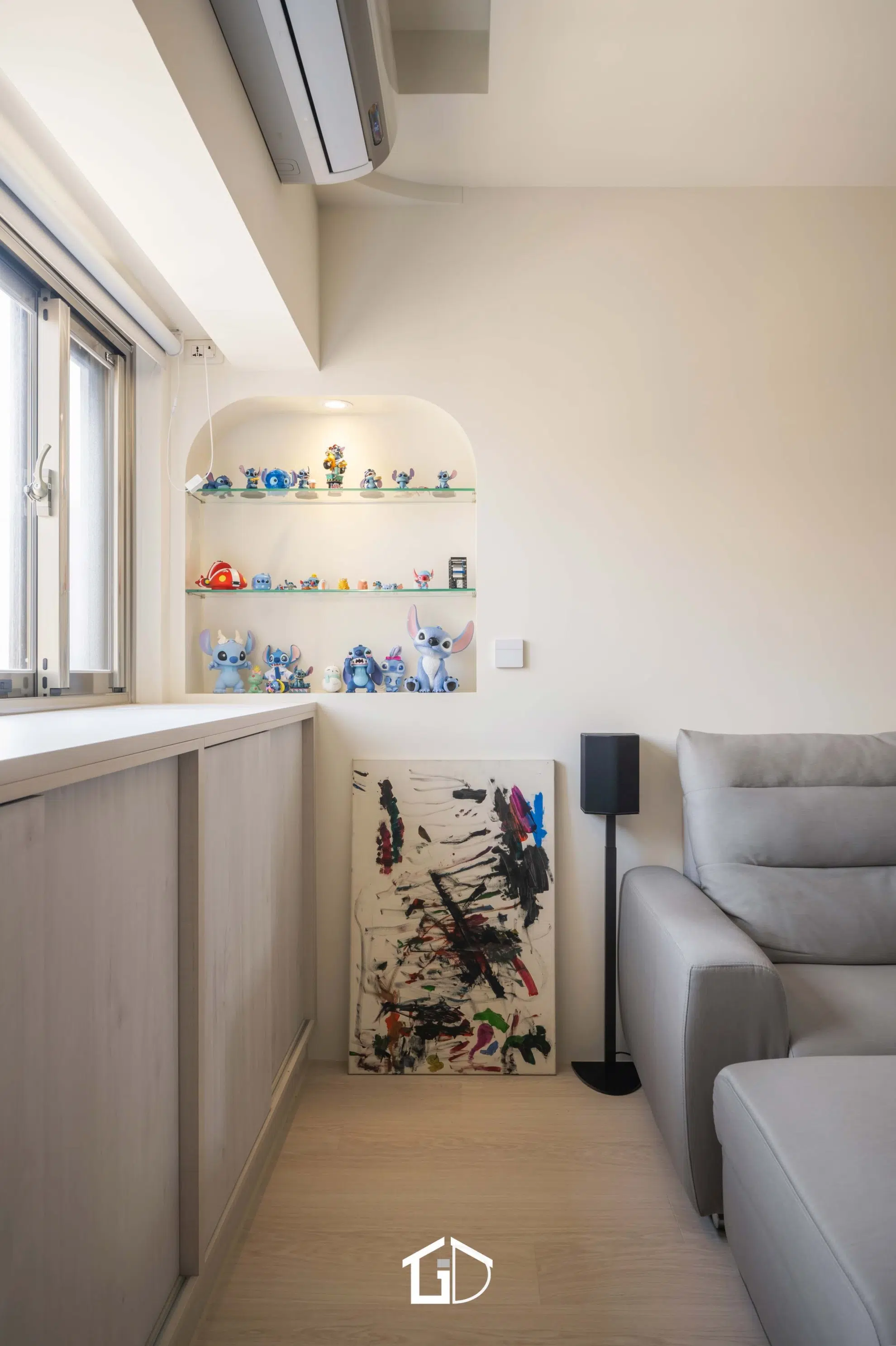 午光和煦,輕柔灑落在淺木與灰沙之間,為這個小宅注入如晨光般的恬靜氣息。電視牆採用柔霧特殊漆質感,搭配鐵件層架與玻璃櫃體,讓展示與收納自然交織,不顯壓迫。整體以低彩溫潤色階鋪陳,灰米色沙發、裸木色家具與奶油白收納系統,映出北歐簡約而溫柔的生活軌跡。窗邊小圓几與微型餐桌構成日常的光影座標,細節處處透露「剛剛好」的從容。這是一個為當代小宅量身訂製的靜謐容器,留給居住者更多生活的餘白與心靈的緩衝。